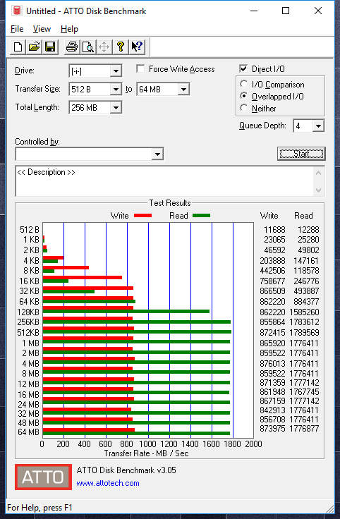 ATTO shows that the MP300 was able to deliver read speeds of up to 1.77GB/s and write speeds of up to 873MB/s. One thing to point out, the small file size performance starts off fairly poor compared to other NVMe SSDs and even SATA SSDs.