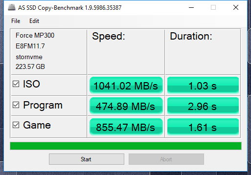 In AS SSD, the MP300 scored 2247 points. The sequential performance here is 1.443MB/s in reading and 816MB/s in writing. As well, it reached 196K IOPS read and 166K IOPS write. In 4K random reads at a QD of 1 it delivered 41MB/s and during writes 98MB/s. In the copy benchmark, it copied the ISO at 1041MB/s, the program at 474MB/s and the game at 855MB/s.