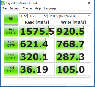 Crystal Disk Mark shows numbers closer to the rated specs, 1,575MB/s read and 920MB/s write. The MP300 reached 36MB/s read and 105MB/s write in the 4K random tests at a queue depth of one.