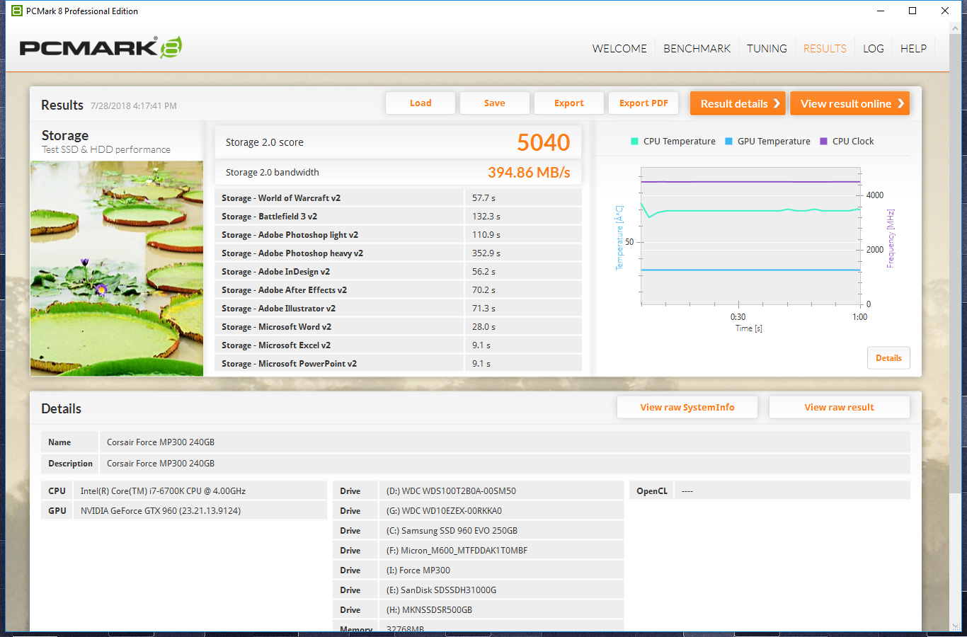 The Corsair Force MP300 delivers a score of 5040 and averaged a bandwidth of 394.86MB/s.