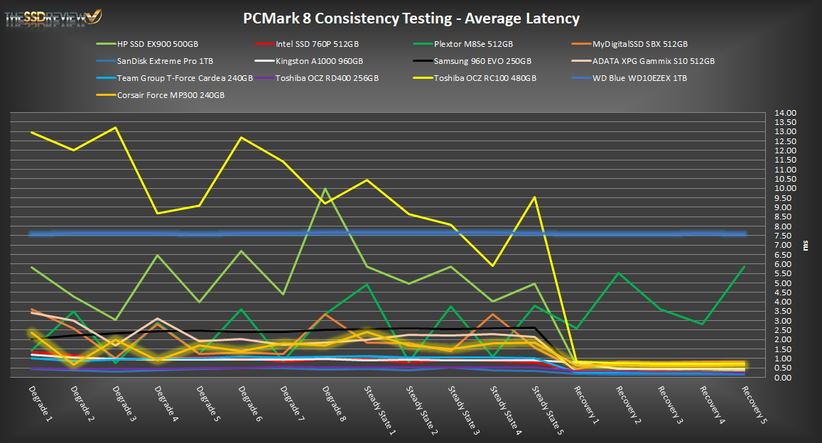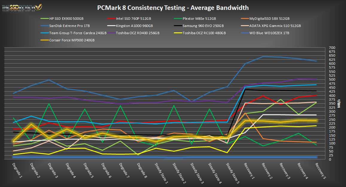 In reading the results, the Degrade and Steady State phases represent heavy workload testing while the recovery phase represents typical consumer light workload testing.