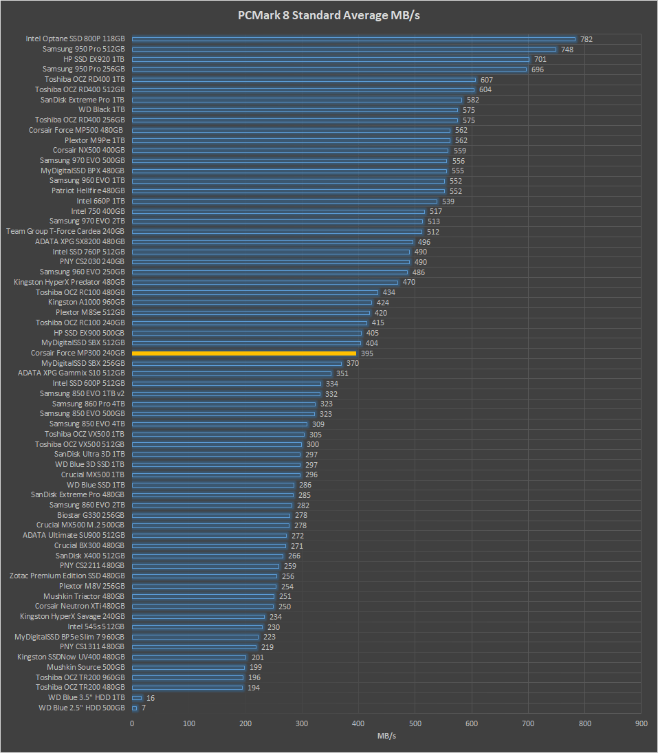 During the PCMark 8 extended test, the MP300 traded blows with the Samsung 960 EVO, although it was at a more inconsistent rate. Once in the recovery phase of the test, It delivered better performance than the Toshiba RC100, Plextor M8Se, MyDigitalSSD SBX, and the hard drive.
