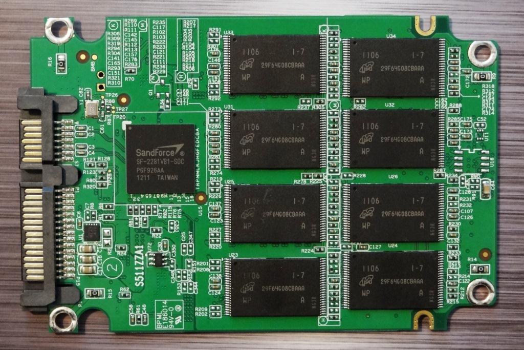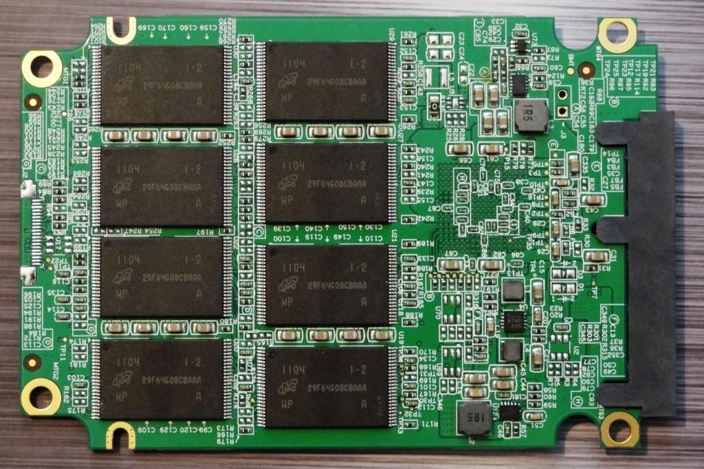 Eight modules of Micron 25nm asynchronous NAND flash memory are located on each side of the PCB, each with a total capacity of 8GB for 128GB RAW capacity. One module is dedicated to firmware and over provisioning which reduces the SSD to its advertised size of 120GB and formatting further reduces total available capacity to 112GB for consumer use.