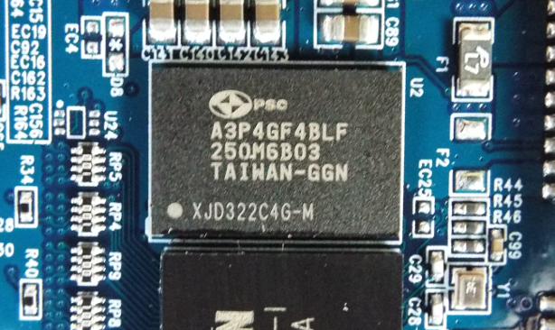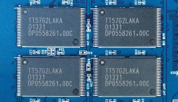 The 16GB NAND modules, of which there are a total of 16 (8 on the top side, 8 on the bottom side) are Toshiba 19nm architecture multi-level cell (MLC). Here we see a quartet of them: