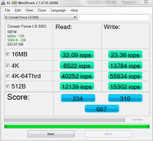 AS SSD was until recently the only benchmark created specifically for SSD testing, and it uses incompressible data. For the most part, AS SSD shows us “worst case scenario” SSD transfer speeds because of its use of incompressible data. Enthusiasts often prefer AS SSD for this reason, as they seek to see minimum performance as well as maximum performance. Transfer speeds in MB/s are shown in the left screenshot, IOPs in the right screenshot.