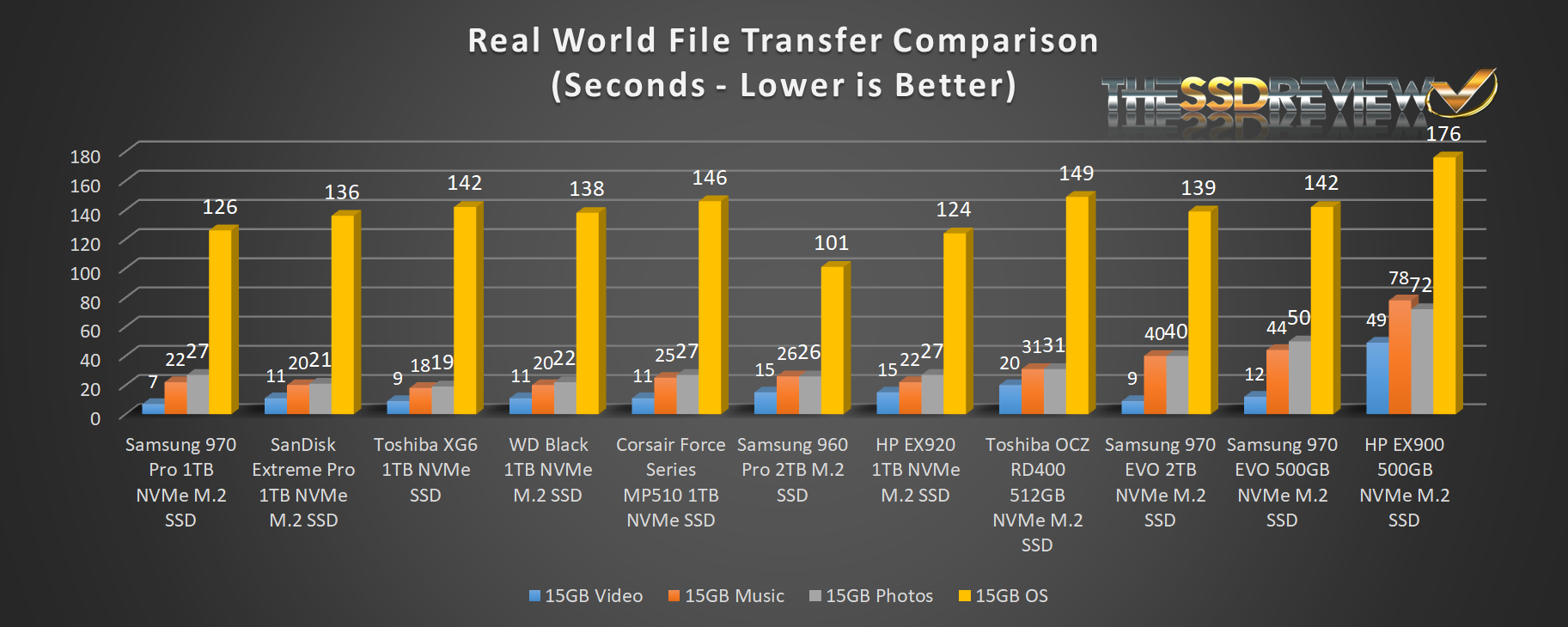 For our Real World File Transfer Comparison, we have included the Samsung 970 Pro, SanDisk Extreme Pro and WD Black 1TB NVMe SSDs, Samsung 960 Pro, HP EX920, Toshiba OCZ RD400, Samsung 970 EVO, HP EX900 NVMe SSD and Toshiba XG6 in our testing with the Corsair Force Series MP510 NVMe SSD. This test is conducted through the transfer of data from one spot on the test drive to another to give us the truest of transfer speed results for that device.