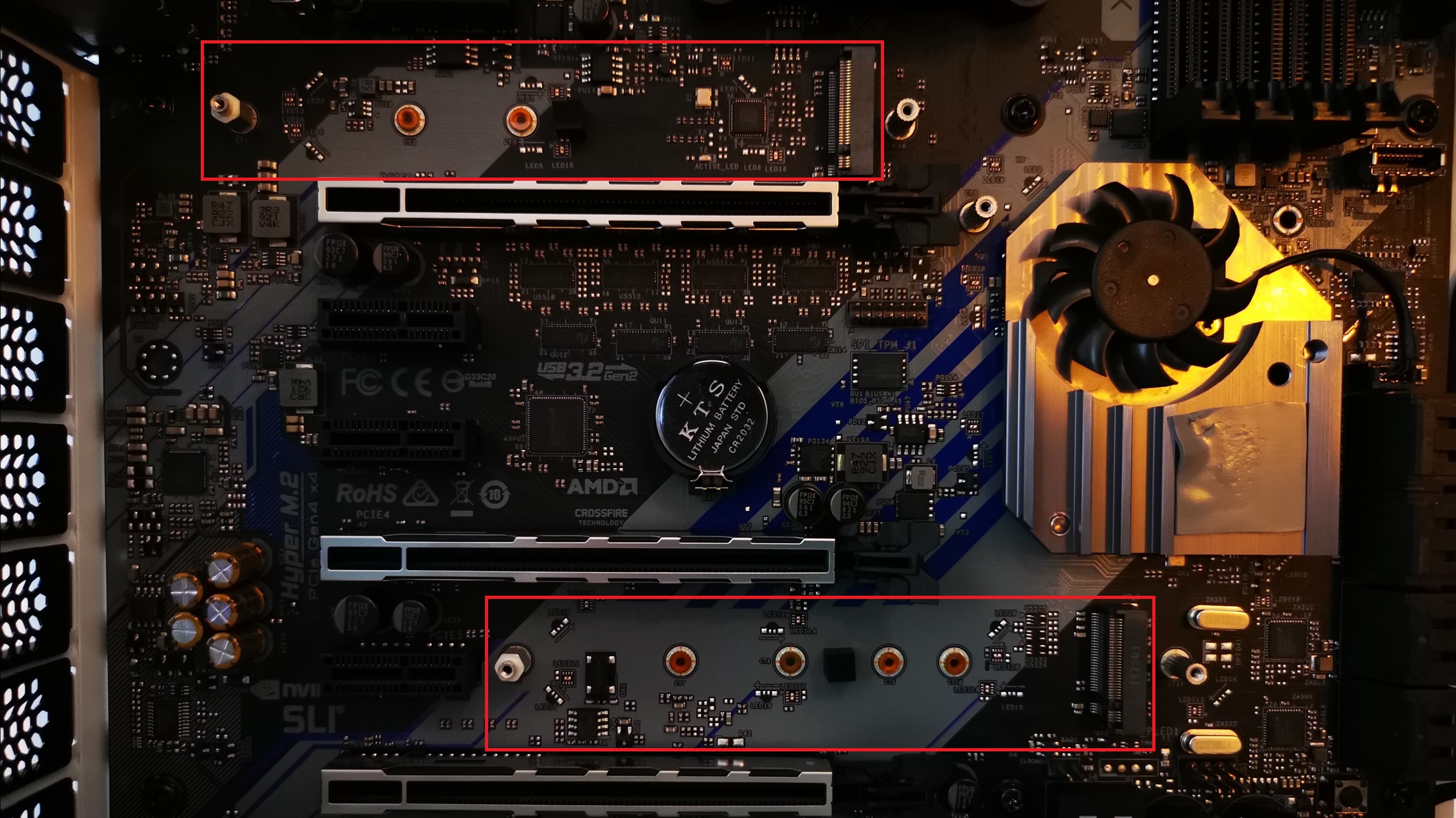 Both of these have the M.2 SSD in contact with conducive thermal tape which dissipates the heat to the think aluminum heatsink, but more importantly, the lower of the two has air routed from the fan and around the SSD before being pushed out the left side.