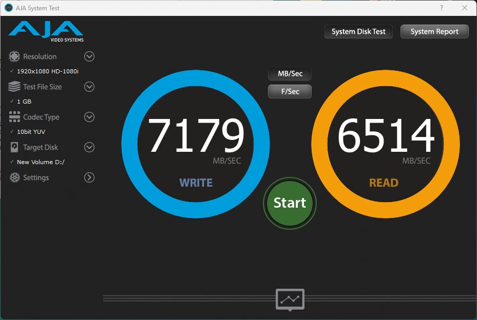 The AJA Video Systems Disk Test is relatively new to our testing and tests the transfer speed of video files with different resolutions and Codec.