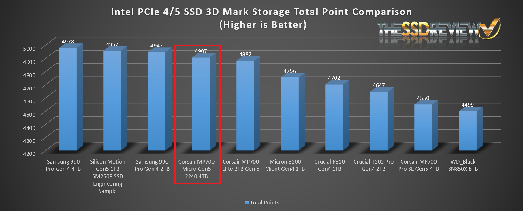 The Cortsair Micro DRAMless SSD did fairly well with 4907 total points. This is not a ‘best of’ chart, but rather a chart which places the Corsair MP700 Micro Gen5 SSD amongst its peers.