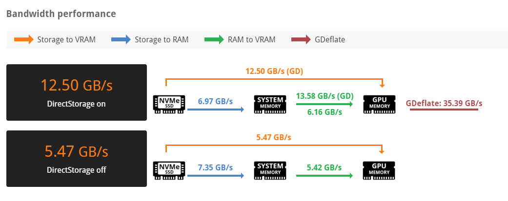 In our testing, data transfer achieved a 128.6% faster transfer of data than with MS DirectStorage disabled.