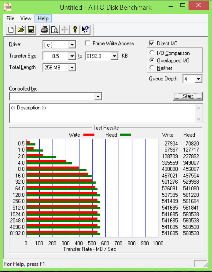 ATTO Disk Benchmark is perhaps one of the oldest benchmarks going and is definitely the main staple for manufacturer performance specifications. ATTO uses RAW or compressible data and, for our benchmarks, we use a set length of 256mb and test both the read and write performance of various transfer sizes ranging from 0.5 to 8192kb. Manufacturers prefer this method of testing as it deals with raw (compressible) data rather than random (includes incompressible data) which, although more realistic, results in lower performance results.