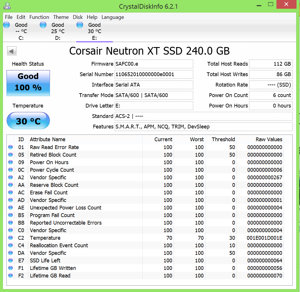 Crystal Disk Info is a great tool for displaying the characteristics and health of storage devices. It displays everything from temperatures, to the number of hours the device has been powered, and even to the extent of informing you of the firmware of the device.