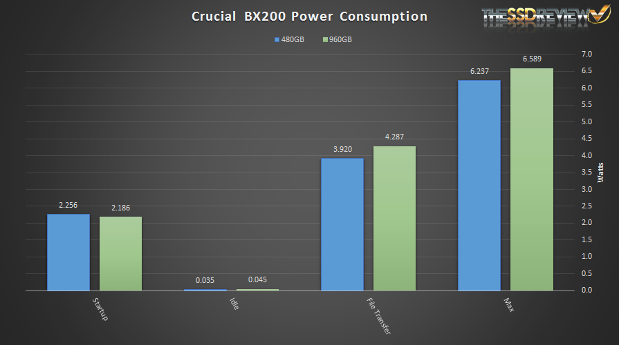 In our testing we have seen slightly different results. At idle we can see that the BX200 is very good, the 480GB capacity consumes just 35mW while the 960GB consumes only a bit more at 45mW due to the extra NAND and DRAM packages. Our active power consumption when transferring the 30GB of test files averaged out to 3.9 and 4.28W per the 480GB and 960GB capacity respectively. The maximum consumption recorded throughout testing was a bit over 6W each.
