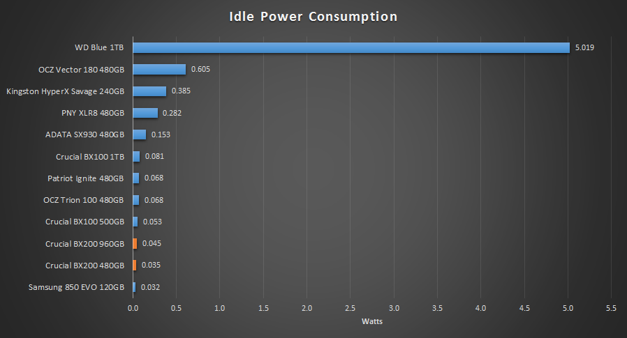 Finally, we wanted to post up a graph of the difference between many of the current SSD options in the market. Again, idle accounts for the majority power draw of a drive, therefore we feel we should compare it. In the chart above we can see that SSDs are magnitudes more efficient than standard HDDs. The BX200 drives are among the lowest in the comparison, which is a nice plus. Also, compared to the BX100, the BX200 does indeed consume less power at idle.