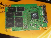 blankInside we have a single PCB (Printed Circuit Board) which has the SATA 3 interface seen on the right side of the PCB, the Marvell controller which is distinctly stamped with the company logo as well as 8x4Gb 34nm NAND flash memory chips on each side which makeup for the 64Gb size of the drive (16Gbx4). NAND flash is a type of non-volatile memory which does not require continuous power in order to retain its data. This drive is practically identical to its big brother of the 256Gb size and the only difference is the size of each NAND flash, the 64Gb containing 16x4Gb each and the 256Gb C300 containing 16x16Gb NAND.
