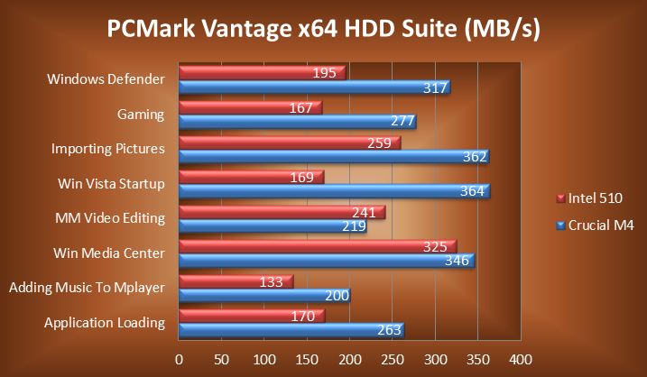 The Crucial M4 128GB SSD flew across the plate with an unbelievable 61750 Total PCMark Vantage points, surpassing that of even its 256GB brother which we couldn’t believe. In fact, we ran both drives 3 time and the 128GB beat out the 256 GB each time, as narrow as the difference was. Lets see how it fares against the Intel 510 series SATA 6Gbps SSD: