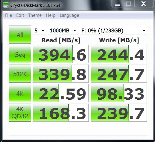 The high sequential performance scores of 394MB/s read and 244MB/s write fell in line with specifications but the two things that surprised us were the 4k random write speeds of 98MB/s and 239MB/s for 4k- QD32. For those who have been following along in past reviews, our assertion of the importance of 4k random write disk access has been clear and consistent and this review affords us an excellent opportunity to show what we mean first hand.