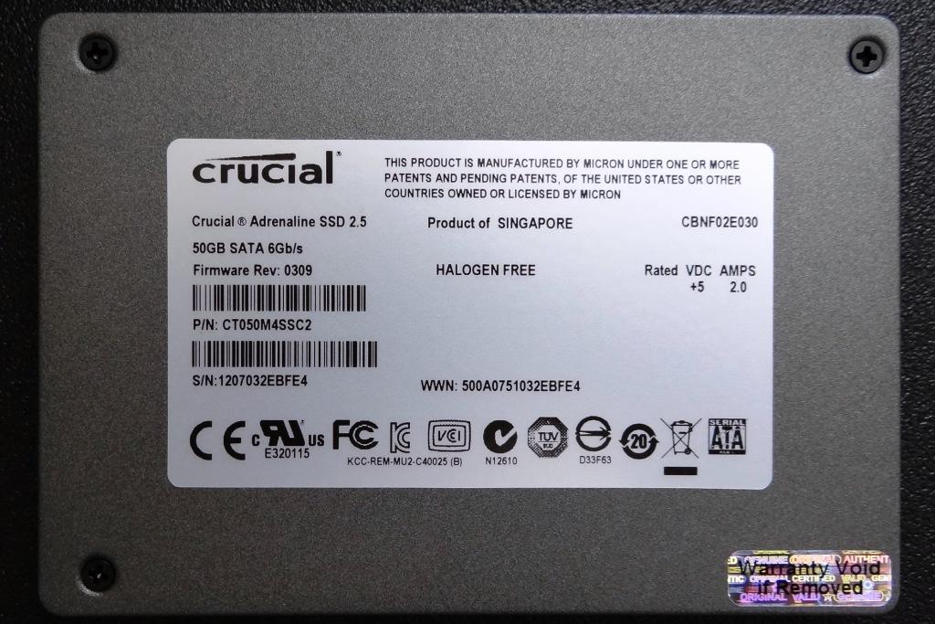 The exterior case is metal and secured by four screws, one of which is covered by security tape and will void your warranty if removed. A quick click on the pictures will enlarge them and you will see the firmware of the SSD to be #0309 which was an excellent firmware upgrade for Crucial as it increased the performance of their M4 SSDs significantly.