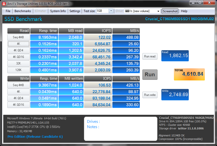 CRUCIAL M500 960GB SSD PCMARK VANTAGE RESULTS