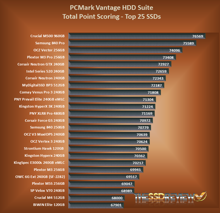 Our SSD Hierarchy displays the top 25 SSDs we have tested to date, rated by their PCMark Vantage Total Score alone. The Crucial m500 SSD is now the top dog on the block!