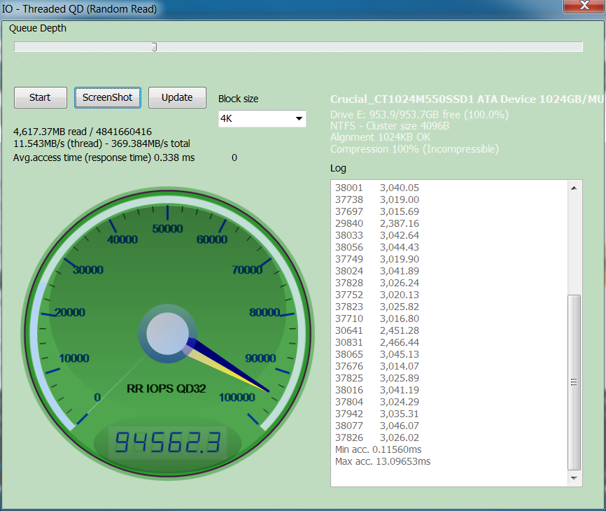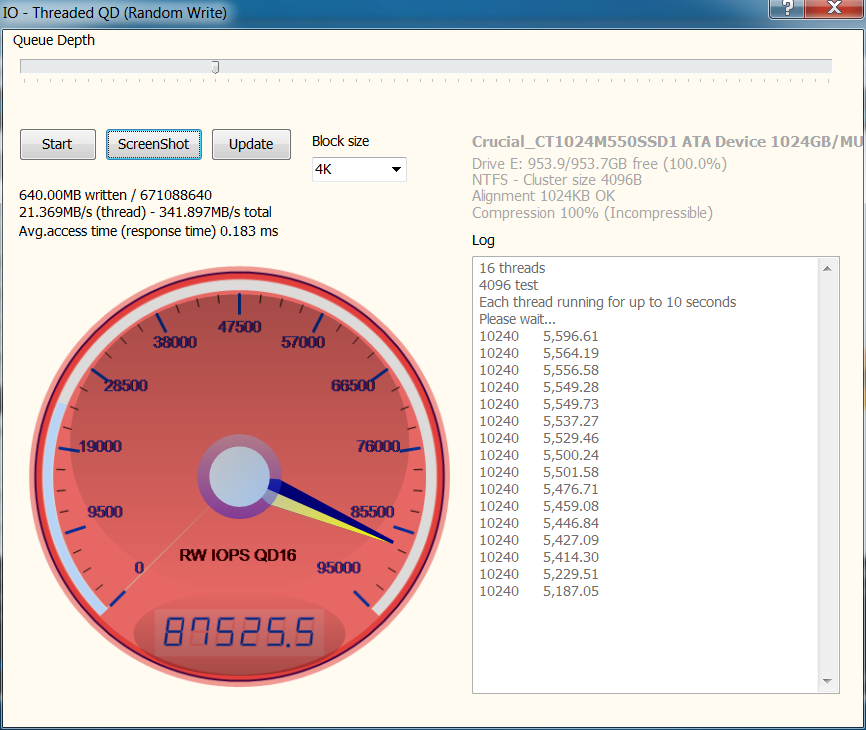 Looking at throughput, once again the high sequential performance is great with the low 4K write speed at 107MB/s and a score of 1093. We also get our first look at IOPS with 87635 being the high for read and 73764 IOPS being the high for write. These are a bit lower than listed IOPS specs of 95K read and 85K write.