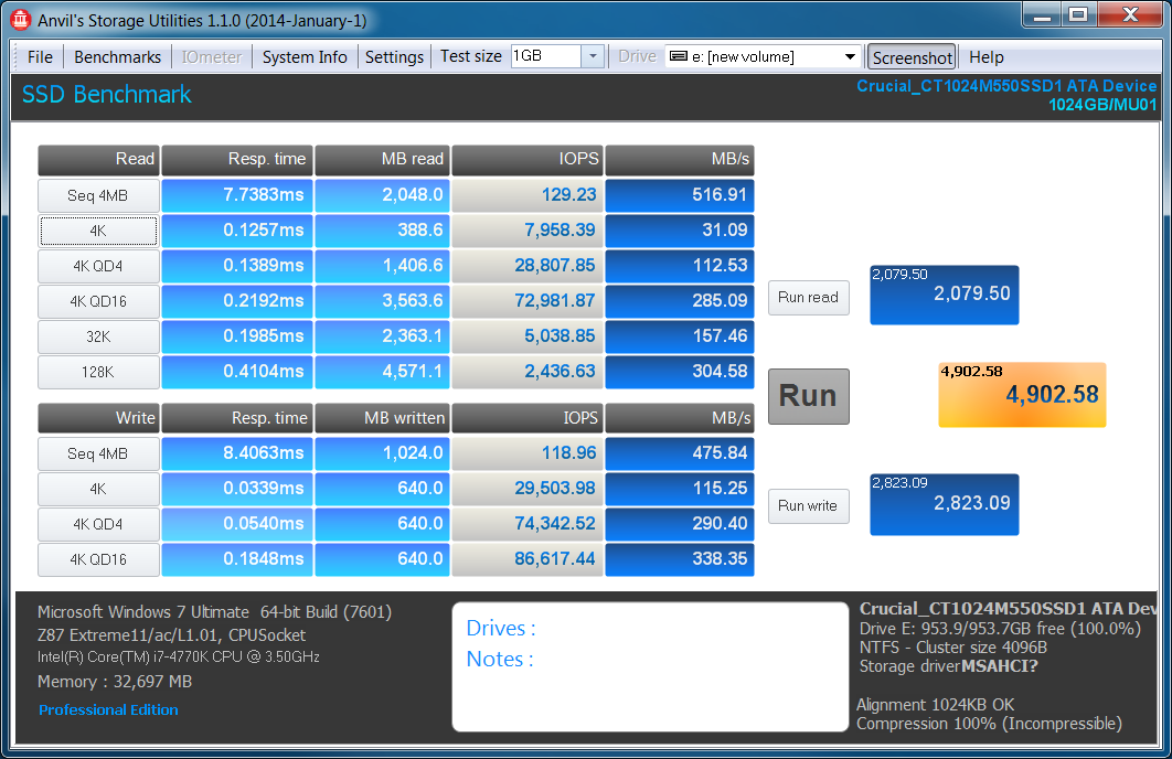 CRUCIAL M550 1TB SSD PCMARK VANTAGE RESULTS