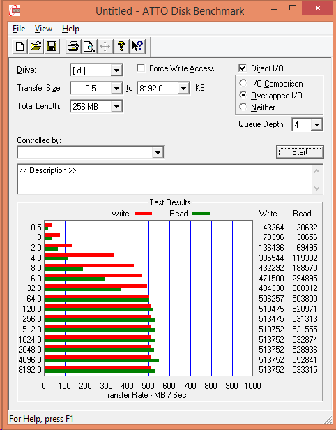 ATTO Disk Benchmark is perhaps one of the oldest benchmarks going and is definitely the main staple for manufacturer performance specifications. ATTO uses RAW or compressible data and, for our benchmarks, we use a set length of 256mb and test both the read and write performance of various transfer sizes ranging from 0.5 to 8192kb. Manufacturers prefer this method of testing as it deals with raw (compressible) data rather than random (includes incompressible data) which, although more realistic, results in lower performance results.