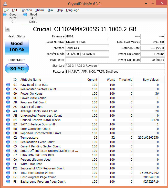 Crystal Disk Info is a great tool for displaying the characteristics and health of storage devices. It displays everything from temperatures, to the number of hours the device has been powered, and even to the extent of informing you of the firmware of the device.