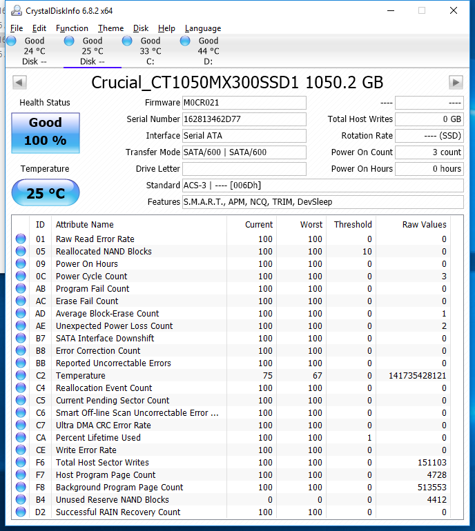 As promised, the Crucial MX300 supports SMART monitoring. It also features a working temperature sensor, a host writes counter, and other useful attributes to follow over the life of the drive. The firmware revision we are testing on today is different than that of the 750GB model we tested before. It is M0CR021. Crystal Disk Info also shows that TRIM and DevSleep are supported as well.