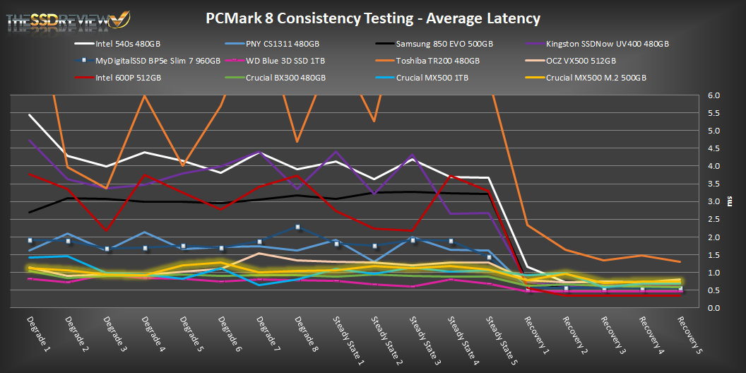 In reading the results, the Degrade and Steady State phases represent heavy workload testing while the recovery phase represents typical consumer light workload testing.