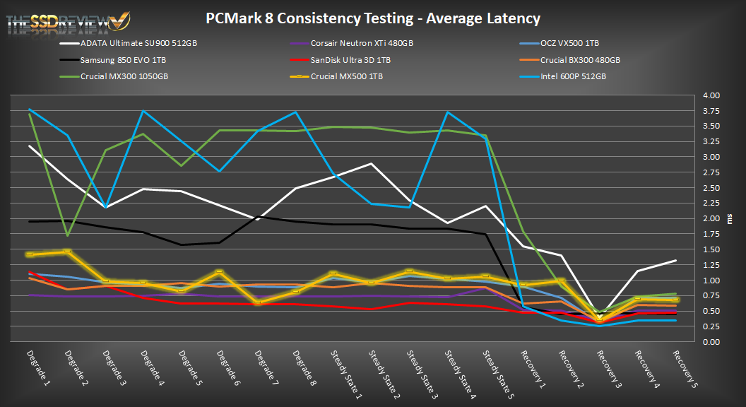 In reading the results, the Degrade and Steady State phases represent heavy workload testing while the recovery phase represents typical consumer light workload testing.