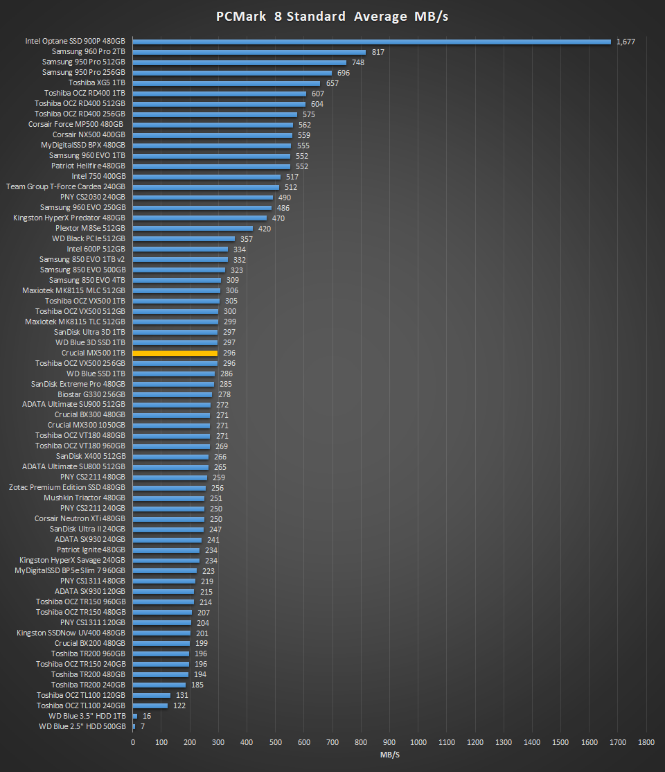 In PCMark 8 the Crucial MX500 4993 points and averaged 296MB/s in bandwidth.