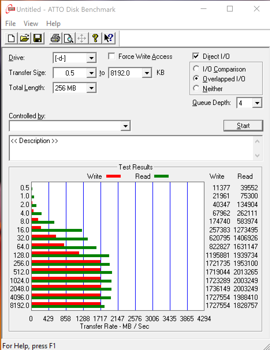 ATTO results are decent as we see a steady progression as data sample sizes increase. The Crucial P1 has also provided performance highs of 2GB/s read and 1,7GB/s write, as listed in product specifications.