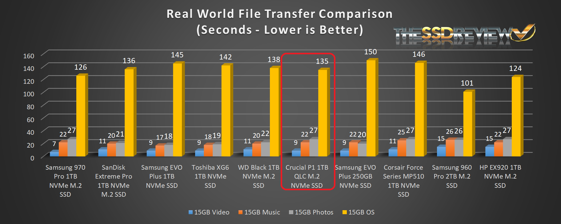 For our Real World File Transfer Comparison of the world’s top M.2 NVMe SSDs, we have included the Samsung 970 Pro, SanDisk Extreme Pro & WD Black 1TB NVMe SSDs, Samsung 970 EVO Plus 1TB and 250GB, Toshiba XG6, Corsair F0rce MP510, Samsung 960 Pro, and HP EX920 1TB, in our testing of the Crucial P1 1TB NVMe SSD. This test is conducted through the transfer of data from one spot on the test drive to another to give us the truest of transfer speed results for that device.