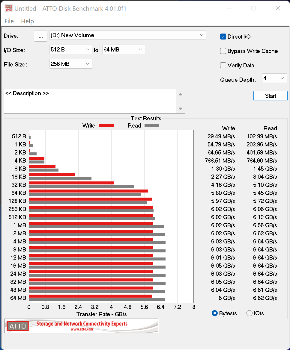 ATTO performance hits highs of 6.64GB/s read and 6.05GB/s write are as good as it gets for a Gen4 4-channel SSD. Very encouraging as well is the fact that performance consistently rises as data sizes increase. We have always found this to be the trademark of a solid SSD.
