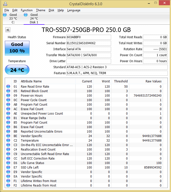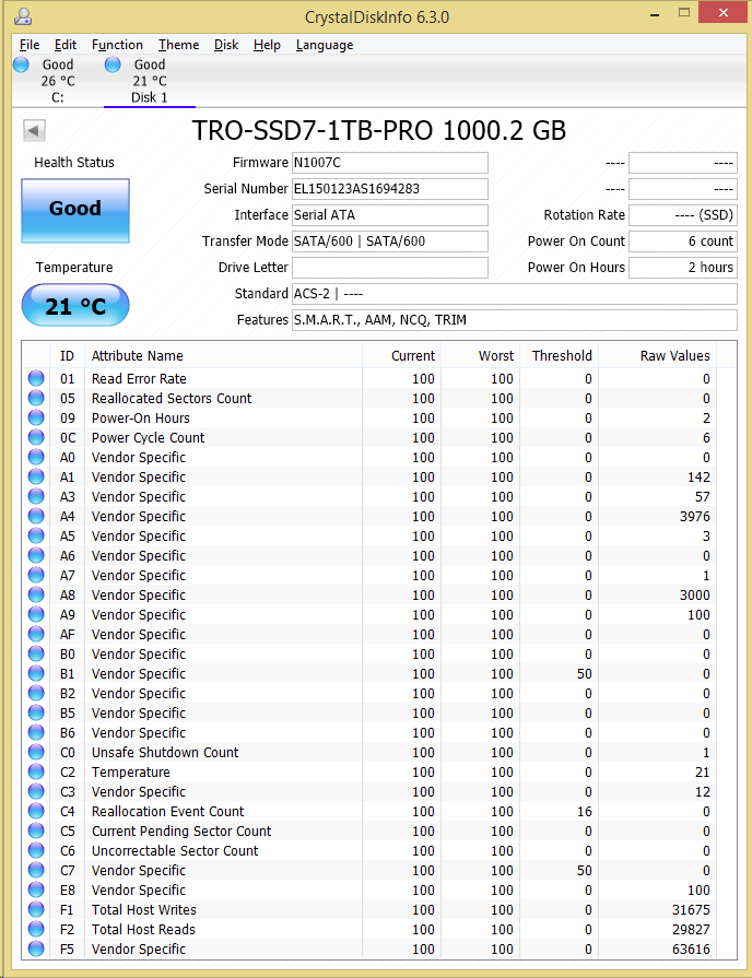 Crystal Disk Info shows us a variety of data for these SSDs including temperatures and read and write counters as well as a whole host of others. We see that the current firmware is 603ABBF0 for the lower two capacities and N1007C for the 1TB. Furthermore, we see that all the features are working properly of which include S.M.A.R.T., APM, NCQ, and TRIM.
