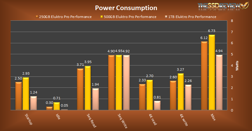Overall, we see that the 1TB is much lower in power consumption than the other two capacities in almost all areas beside sequential write. Also, it is apparent that the 500GB uses the most out of the three on most of the tests. Furthermore, there is a huge percentage leap in power consumption when comparing the three capacities when idling. The power used for idle for the 250GB is six times more than that of the 1TB and the power used for the 500GB is almost two and a half times that. So, if power consumption is a concern for you, you are best off going with the largest capacity model.