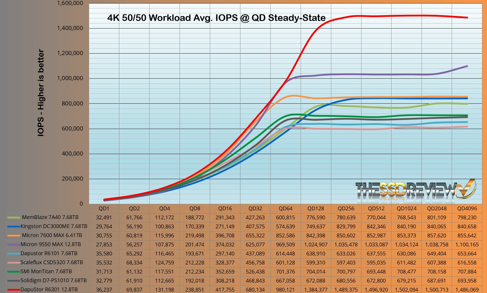 The R6301 pulled off an average performance result of 1502K IOPS through QD512-QD4096.