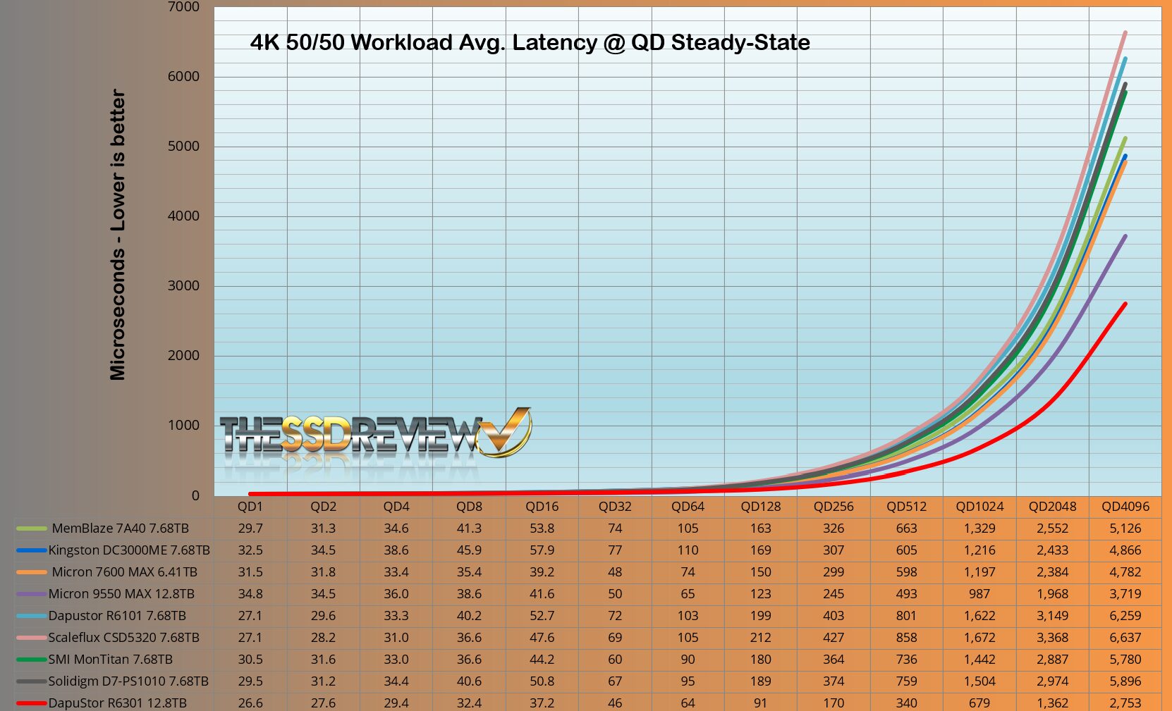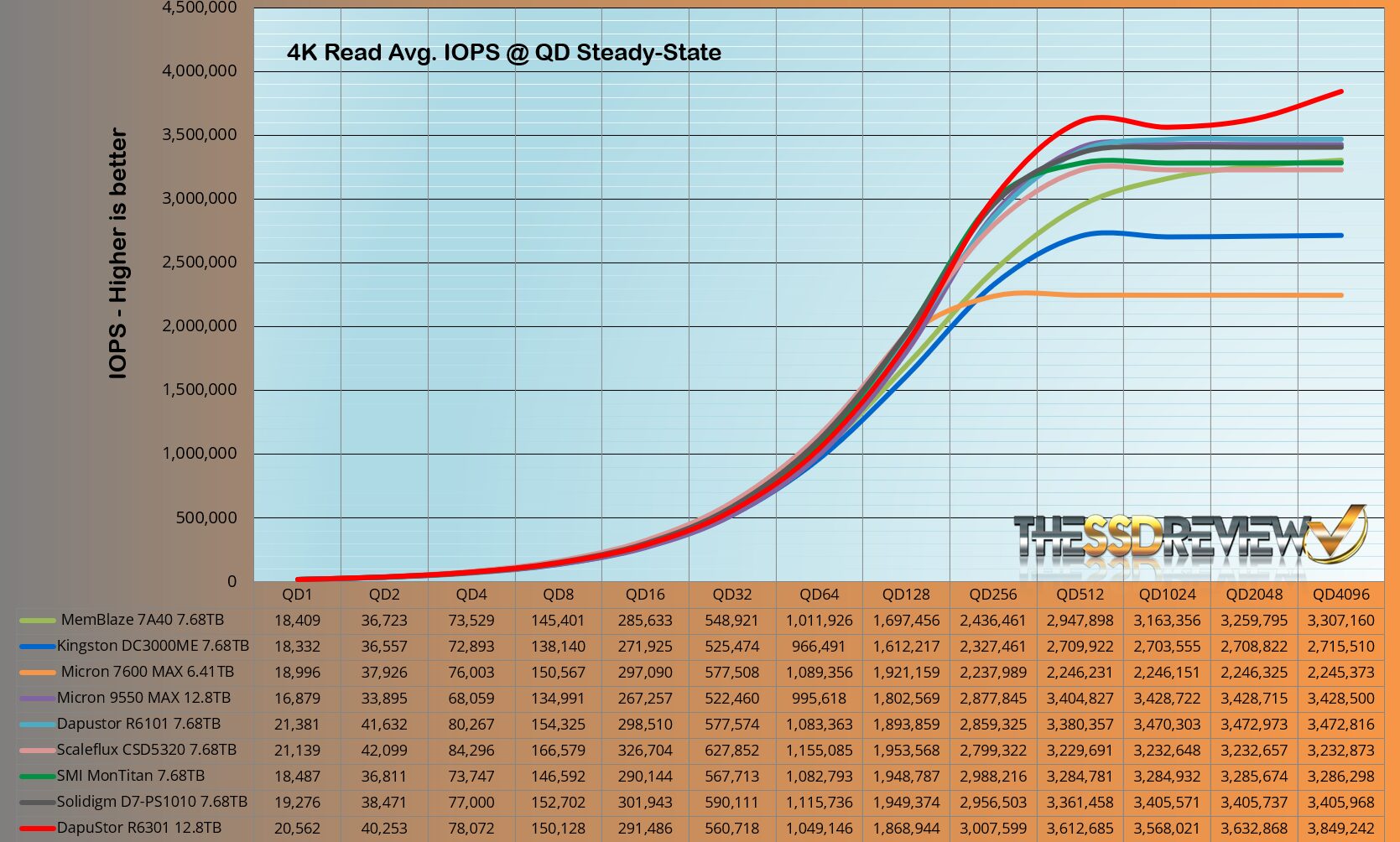 Listed specification for the R6301 Gen5x8 SSD is 4450K IOPS for sustained random read 4K IOPS during steady-state operation and our testing came below that at 3849K .