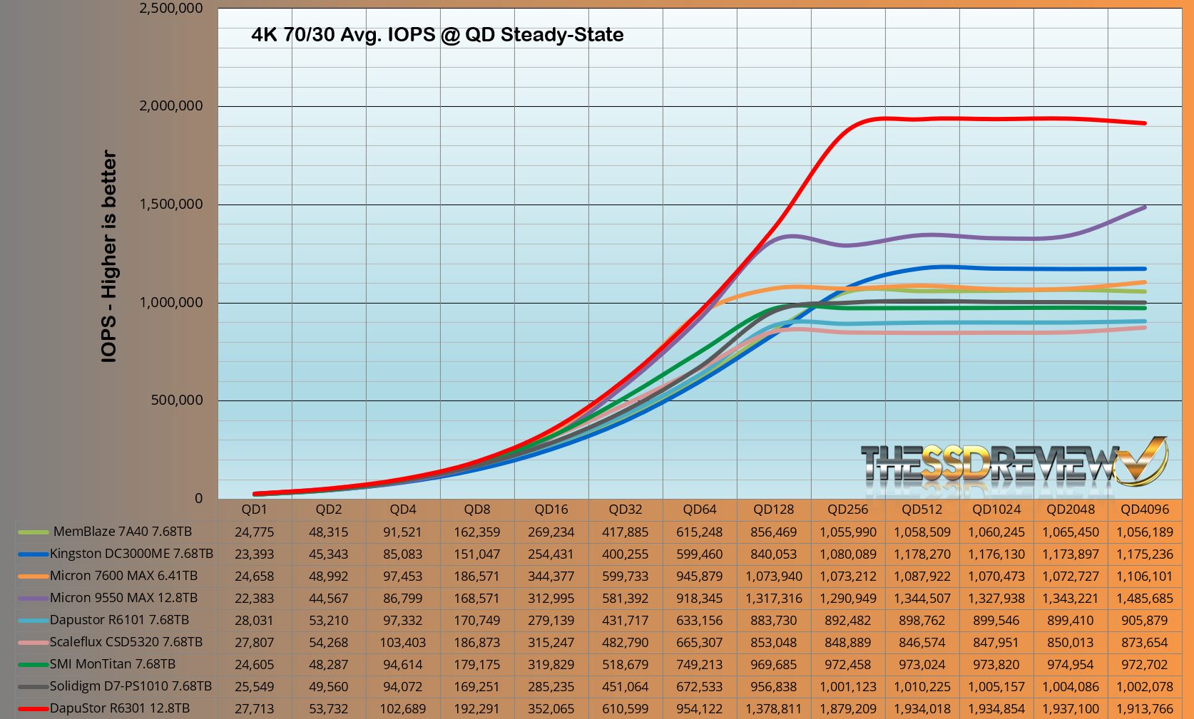 The DapuStor Roealsen6 demonstrates amazing 4K 70/30 mixed read/write results with an average of 1930K IOPS.