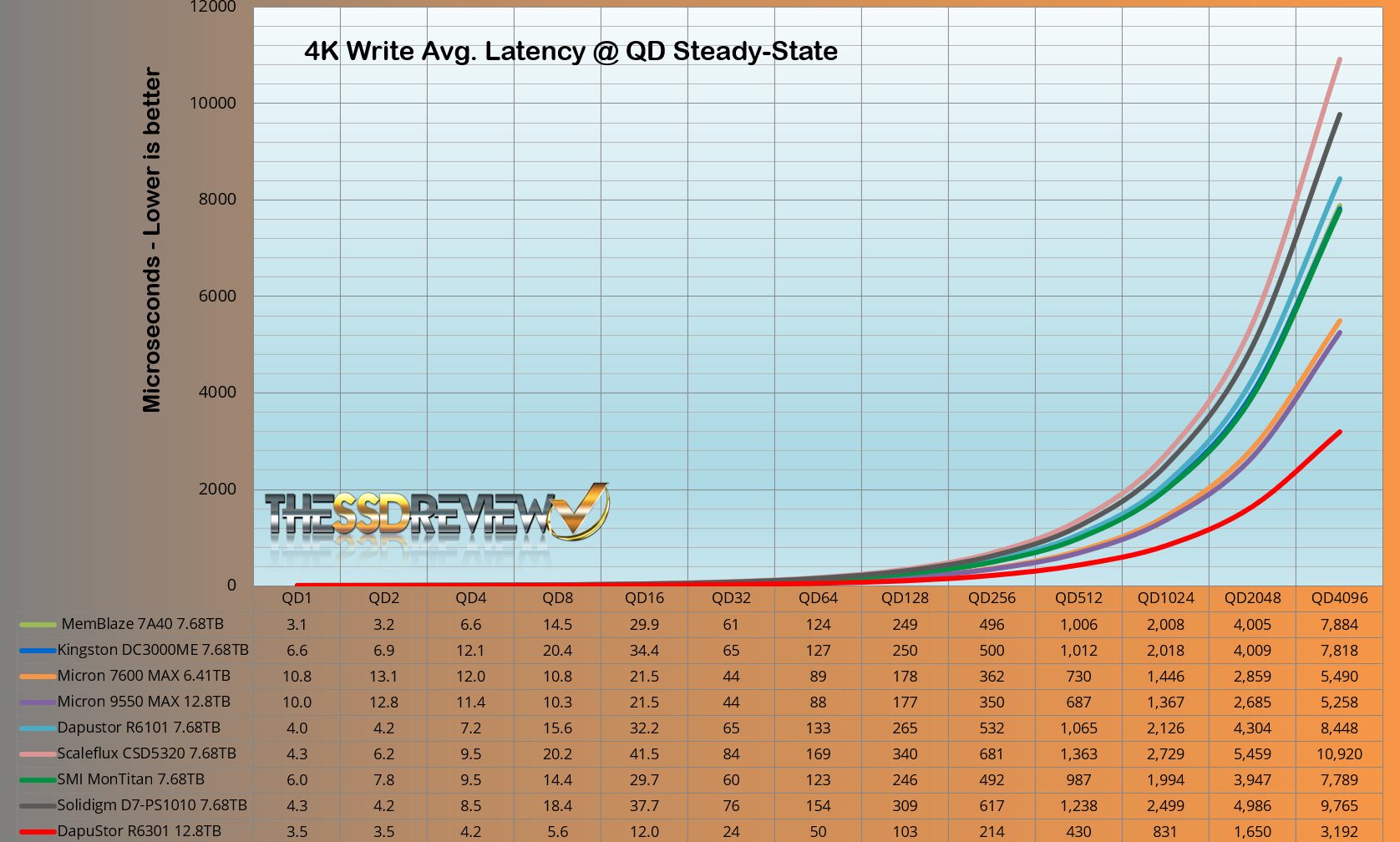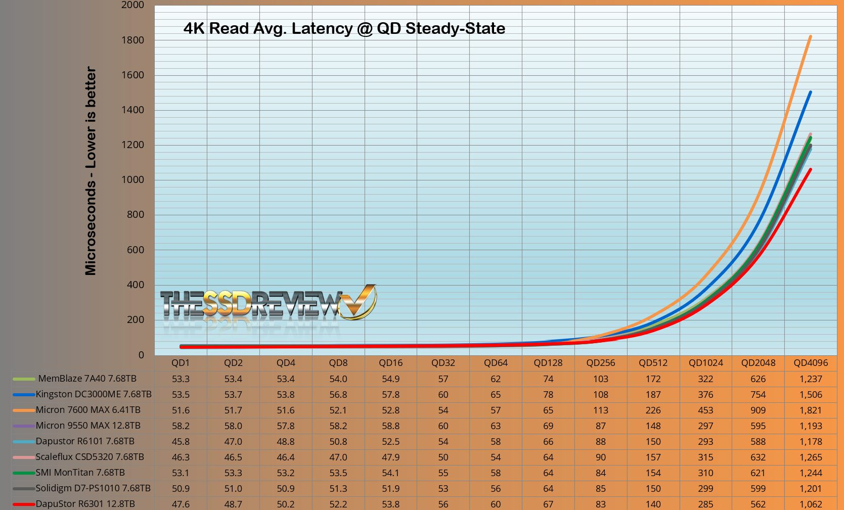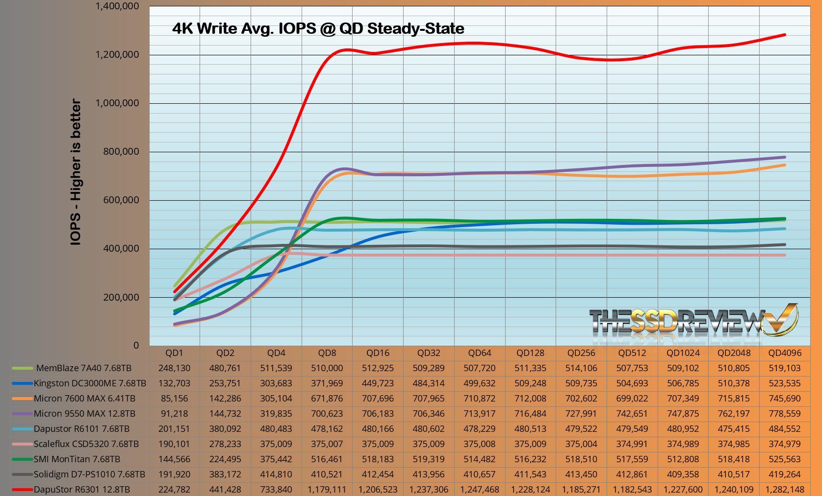 Listed specification for the R6301 Gen5x8 SSD is 1080K IOPS for sustained random write 4K IOPS during steady-state operation and this SSD exceeded that spec at 1282K IOPS.