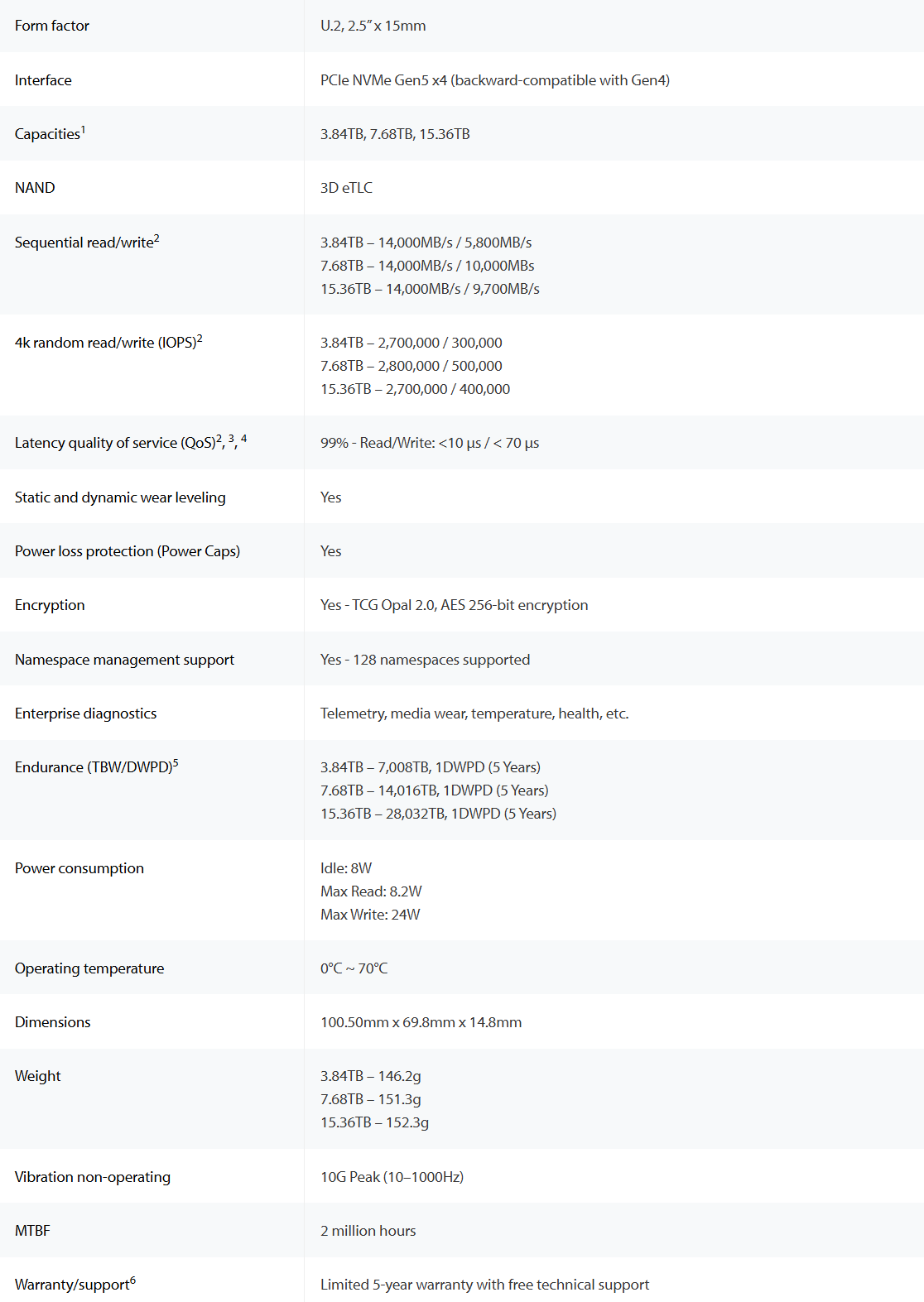 The Kingston DC3000ME Gen5 SSD is a 1-Drive Write Per Day (1DWPD) SSD that achieves endurance of 700TBW for the 3.84TB version and then doubles for every capacity point. This SSD identifies a very respectable 2,000,000 MTBF (mean time between failures) and comes with a 5-year limited warranty.