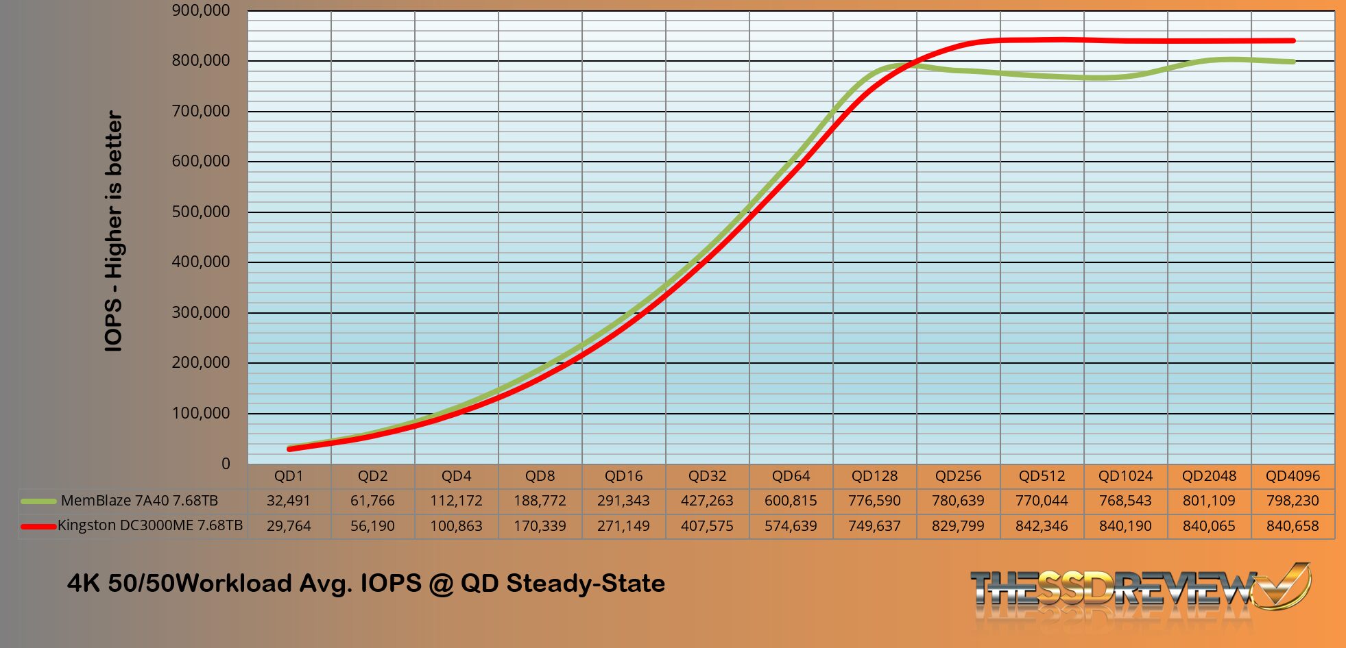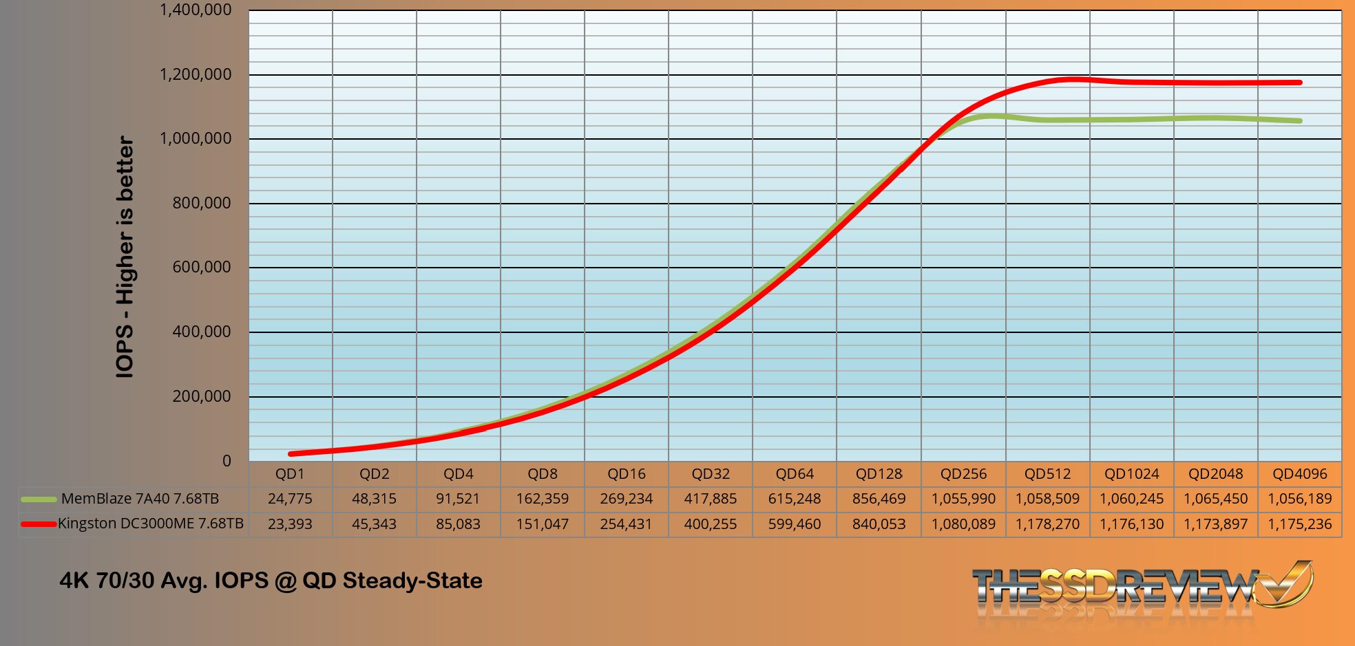 The Kingston DC3000ME pulled off an average performance result of 840K IOPS through QD128-QD4096, which is very impressive for any 1-DWPD SSD. We were very impressed how that curve leveled off an maintained that 840K mark dead on through QD1024-QD4096.