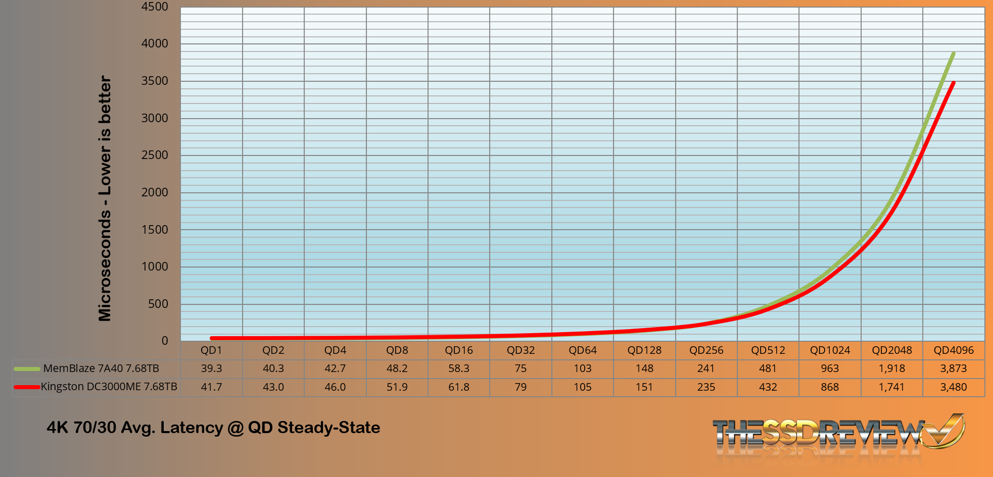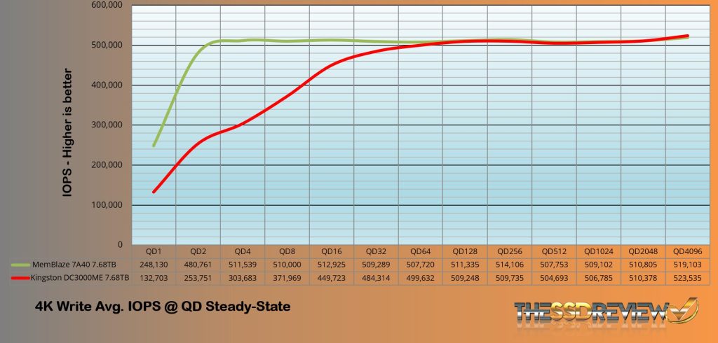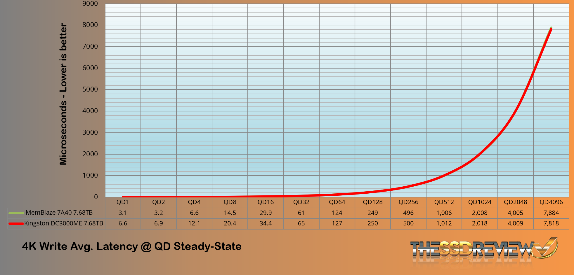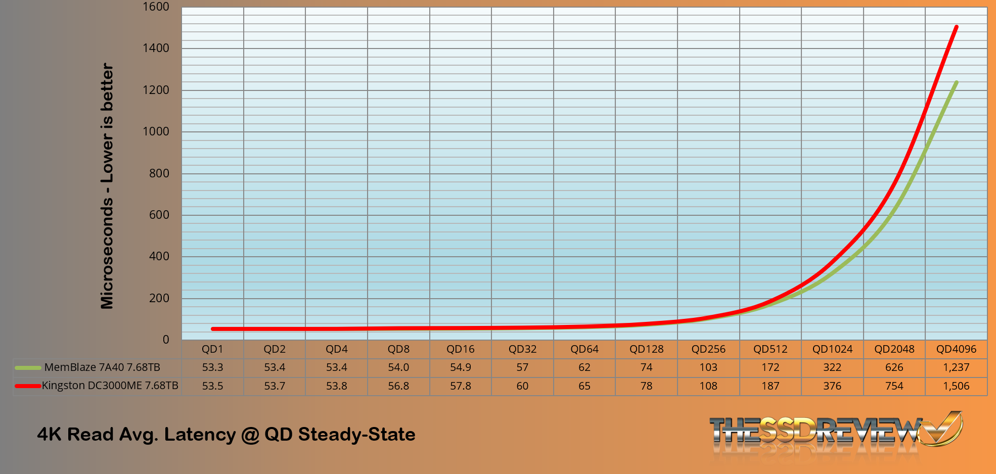 Listed specifications for the Kingston Gen 5 SSD is 500K IOPS for sustained random write 4K IOPS during steady-state operation, whereas our results demonstrated an average of 507K throughout QD64 to QD4096. Comparing the results of the Kingston to the MemBlaze, it is rather amazing how close the latency is between the two for this test, yet the MemBlaze 7A40 gets the upper hand reaching level IOPS at QD2 compared to the Kingston CD3000ME reaching same at QD64. If you look at the very end of the red line at QD4096, you can just barely see the MMemblaze line behind it, validating how close both are.
