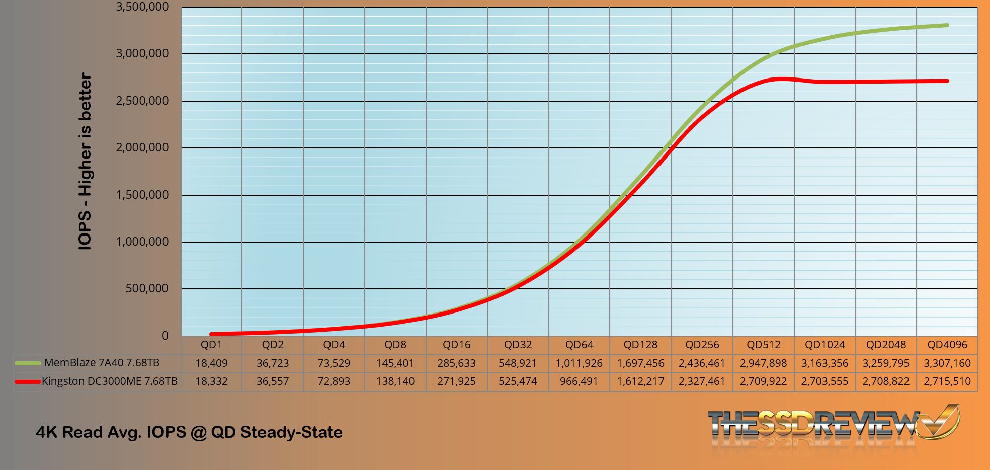 The listed spec for the Kingston DC3000ME Gen5 SSD is 2800K IOPS for sustained random read 4K IOPS during steady-state operation and our testing hit just below that at 2715K IOPS.