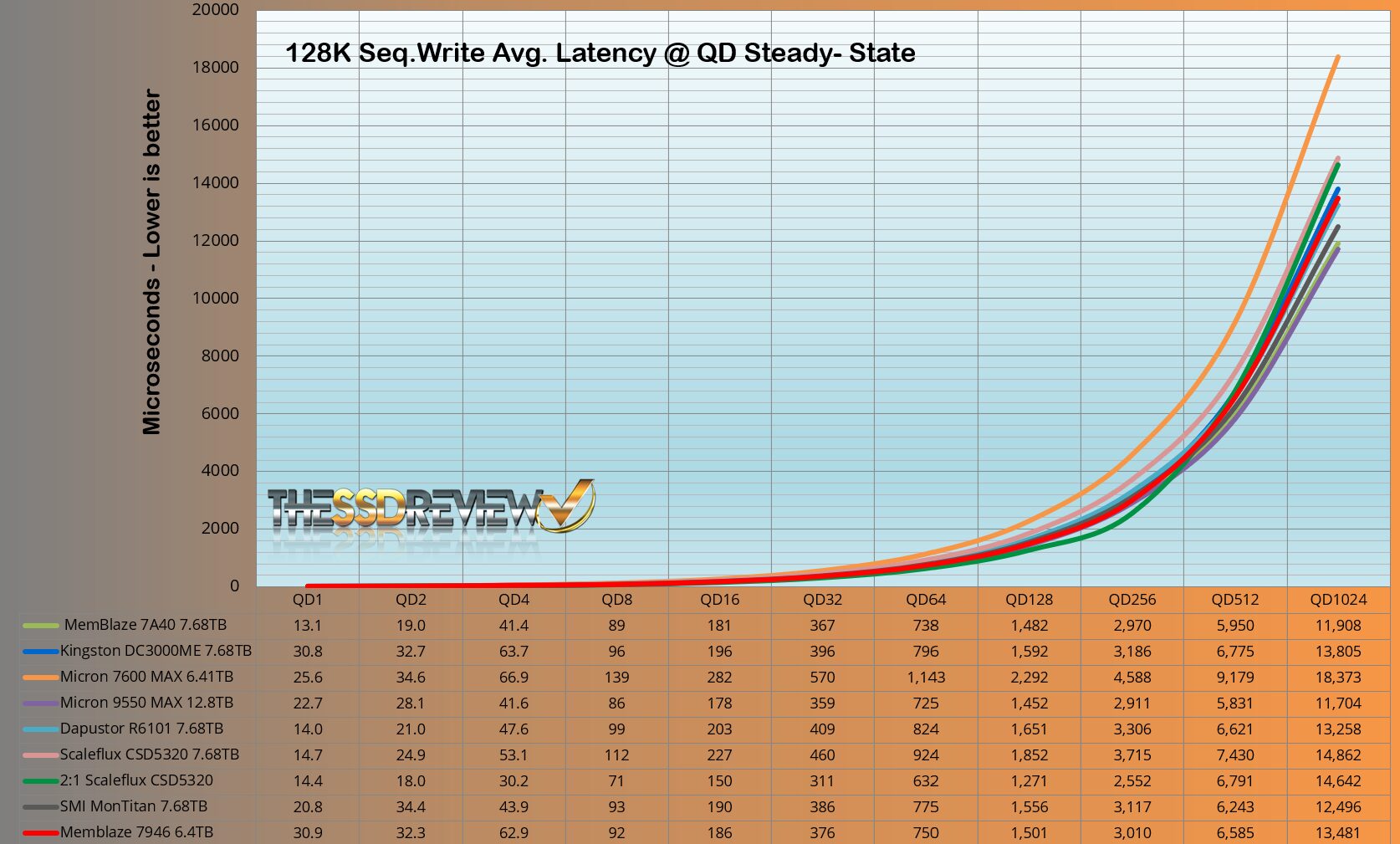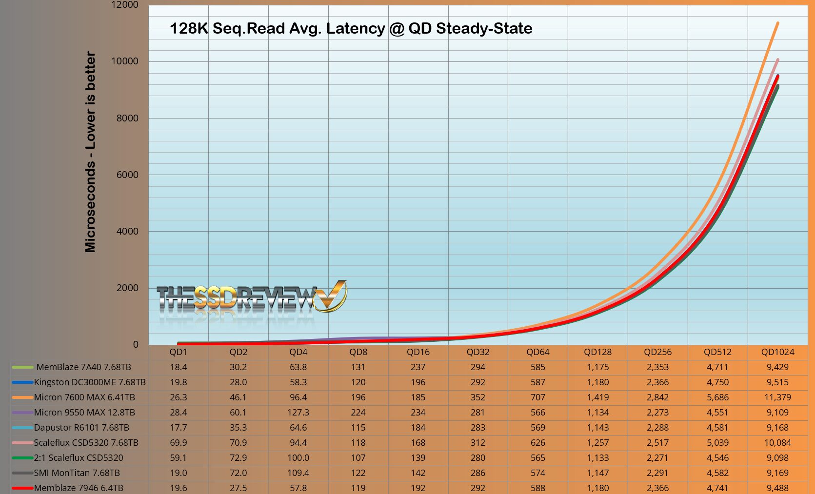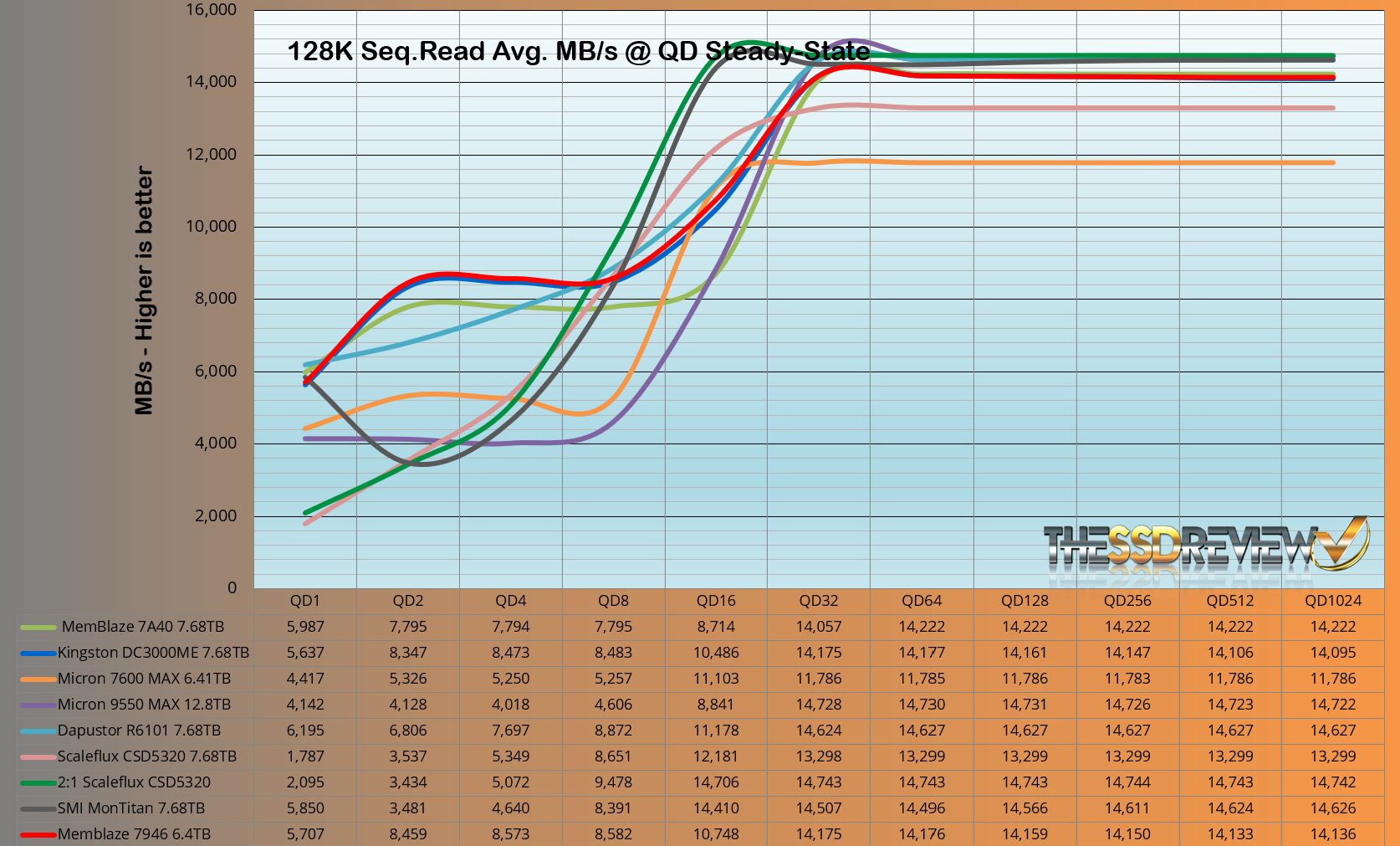 Our test resulted in an average 14.1GB/s read throughput, whereas the listed specification was 14GB/s. Full performance is achieved at QD32 where the performance results in a perfectly flat line until the test was complete. This is very nice to see with 14.1GB/s being the dead on speed through QDs 32, 64, 128, 256, 512 and 1024.