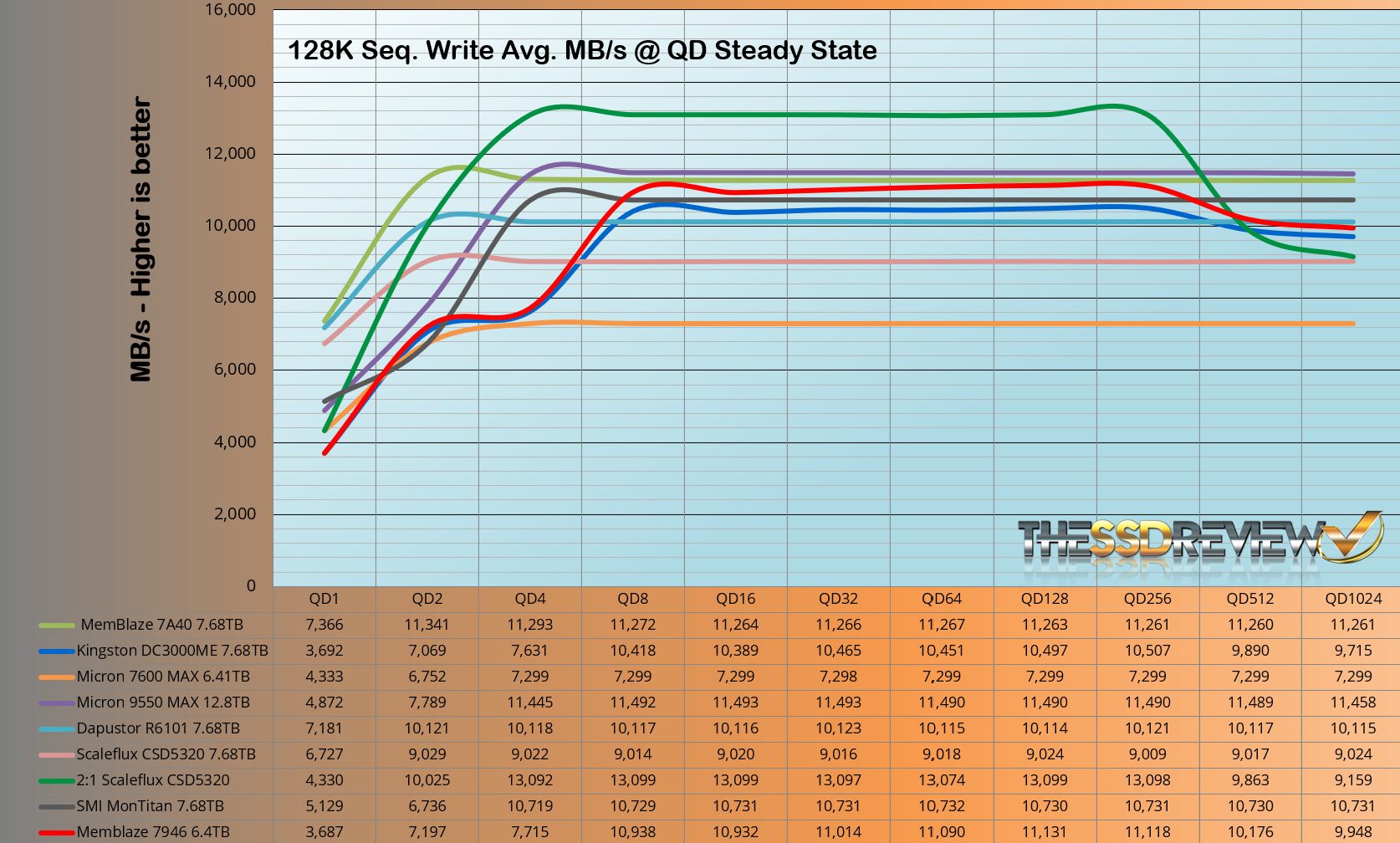 Listed specification for the Memblaze PBlaze 7946 Gen5 6.4TB E3.S SSD is 10GB/s 128K sequential write throughput and our testing provided an average of 11GB/s.