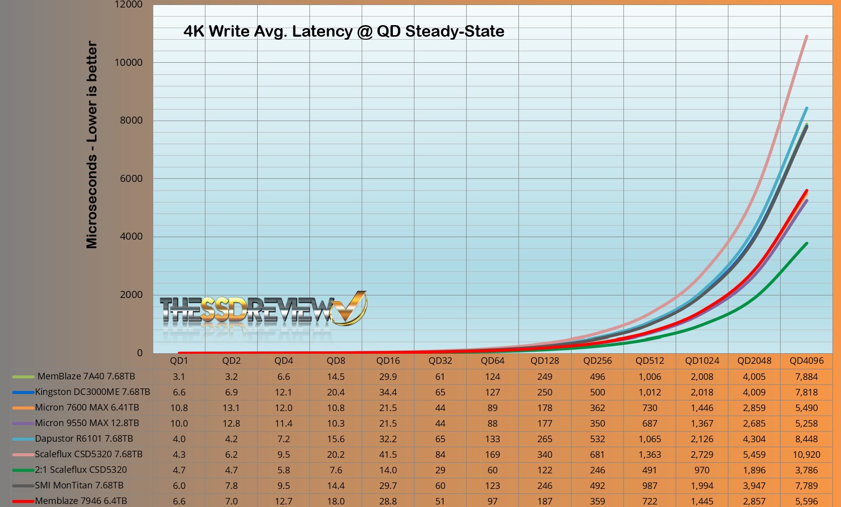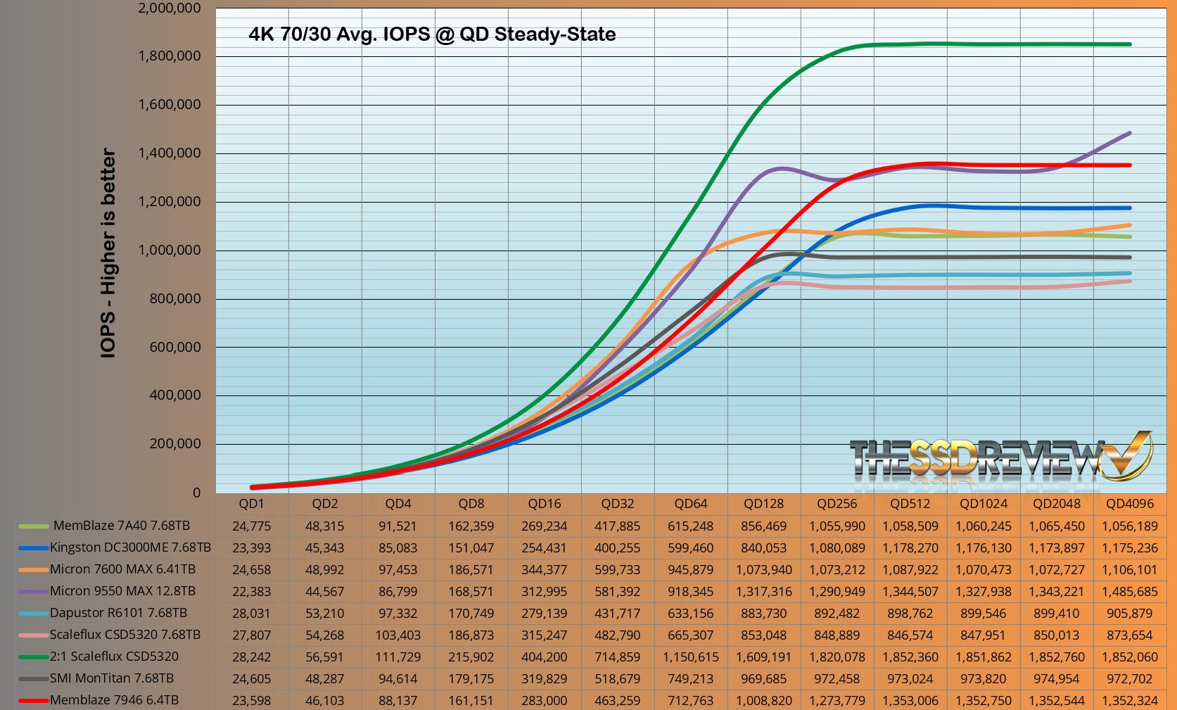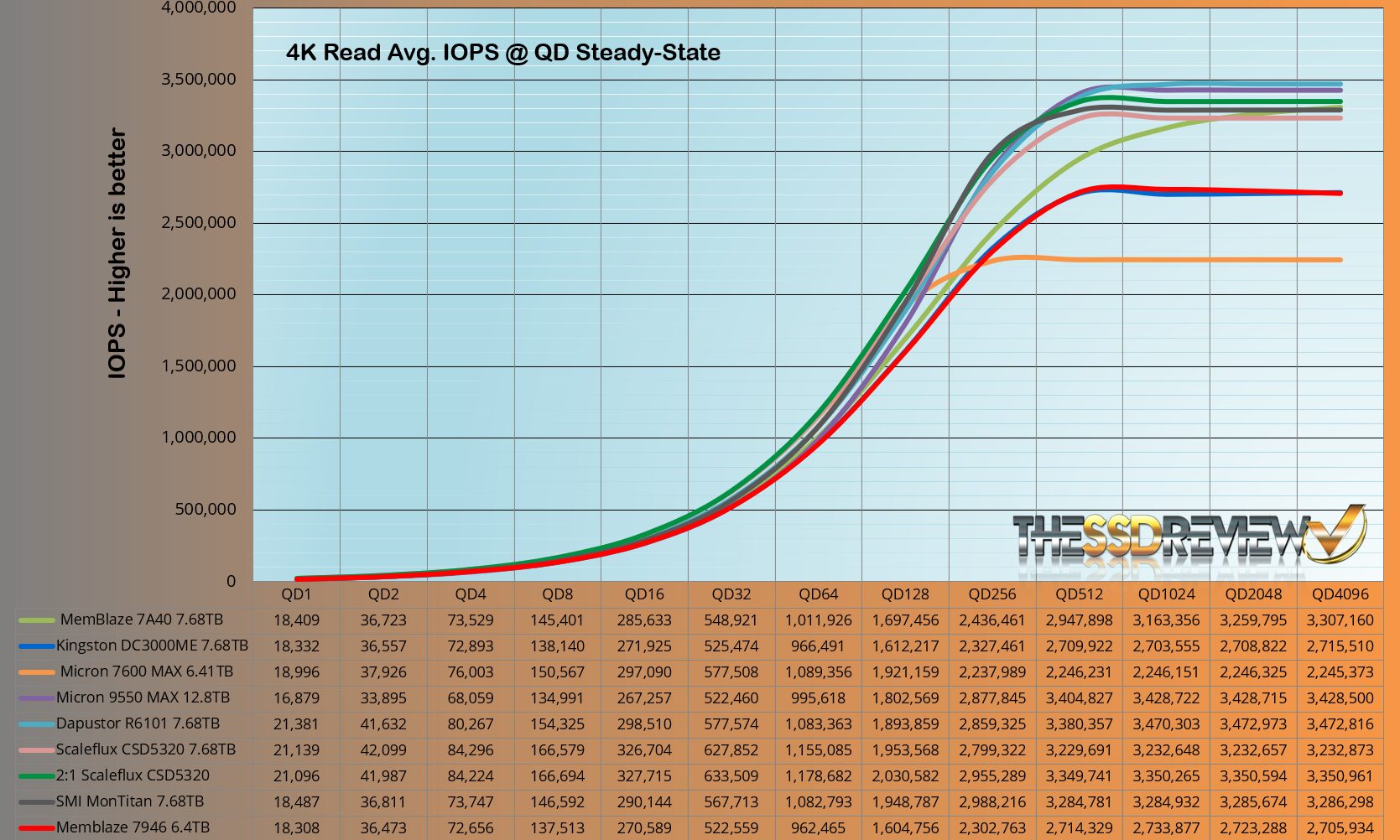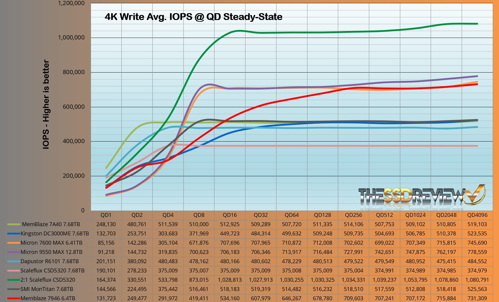 The Memblaze 7946 pulled off an average performance result of 1039K IOPS through QD512-QD4096, which is very impressive for any 3-DWPD SSD.