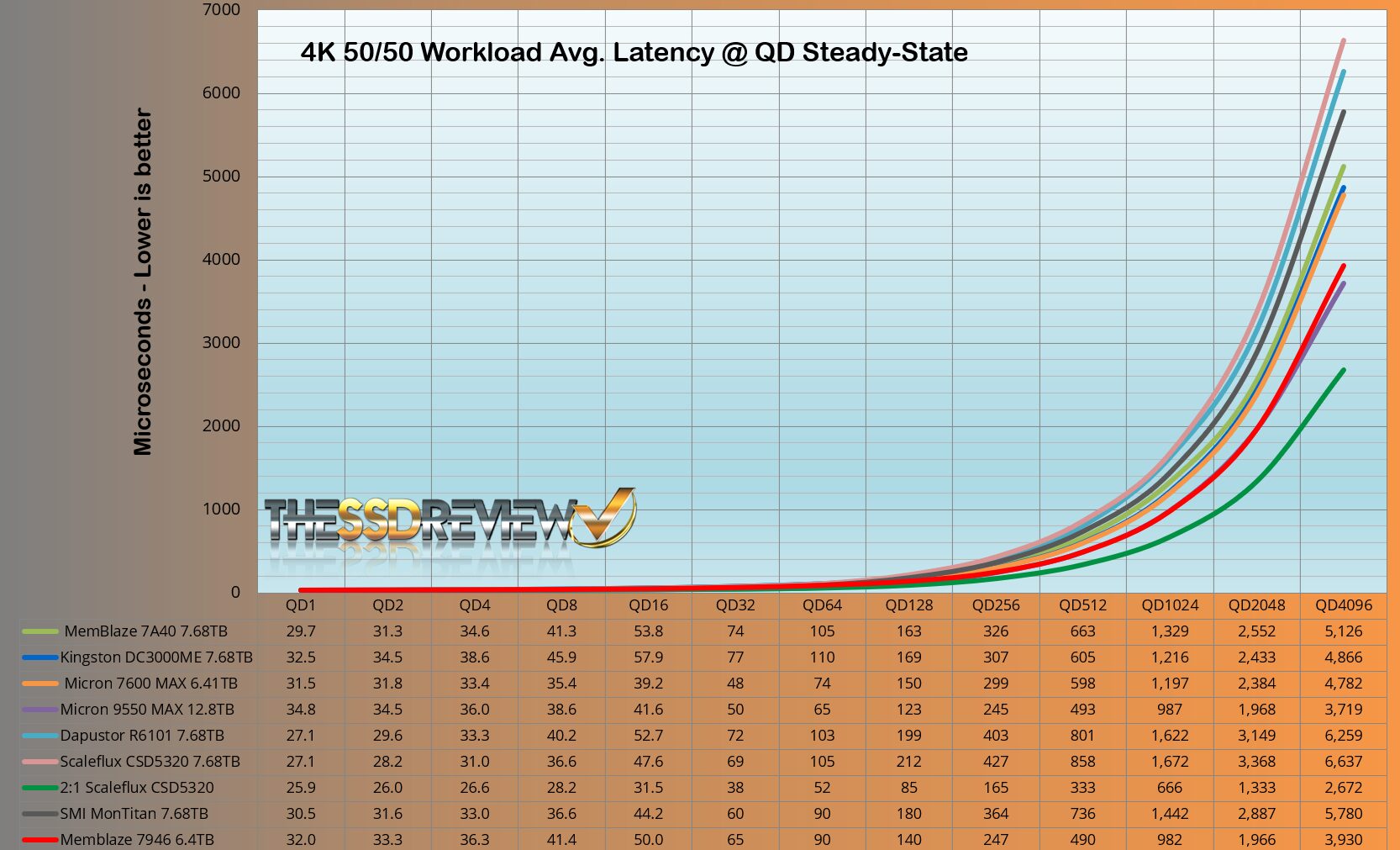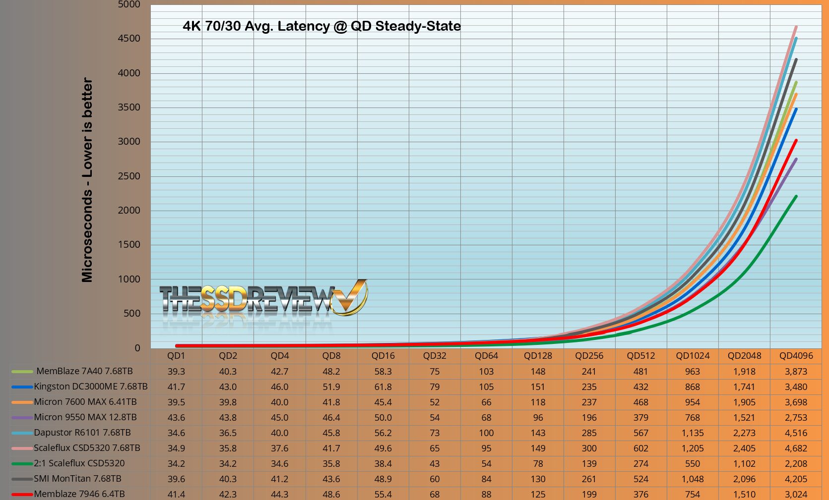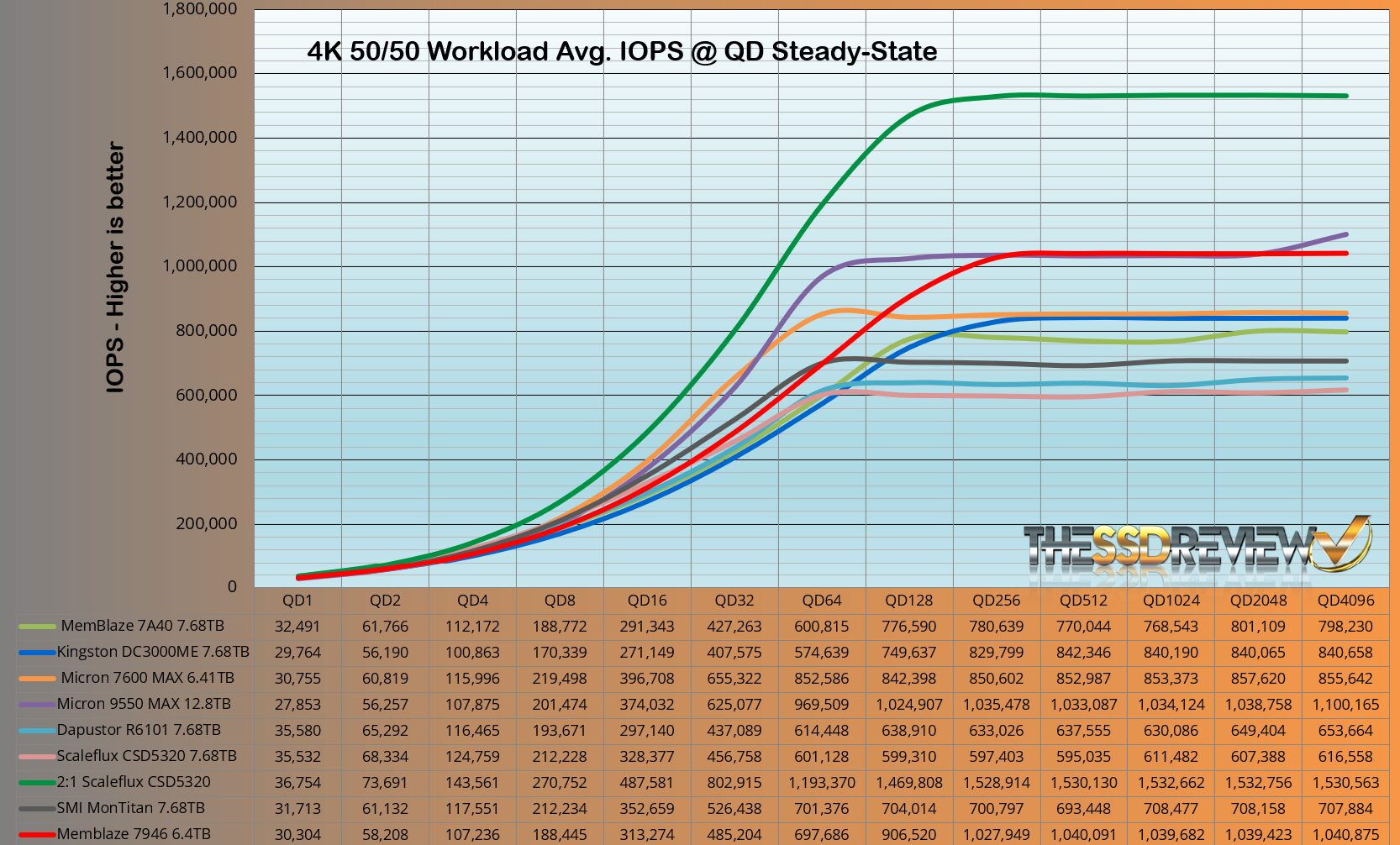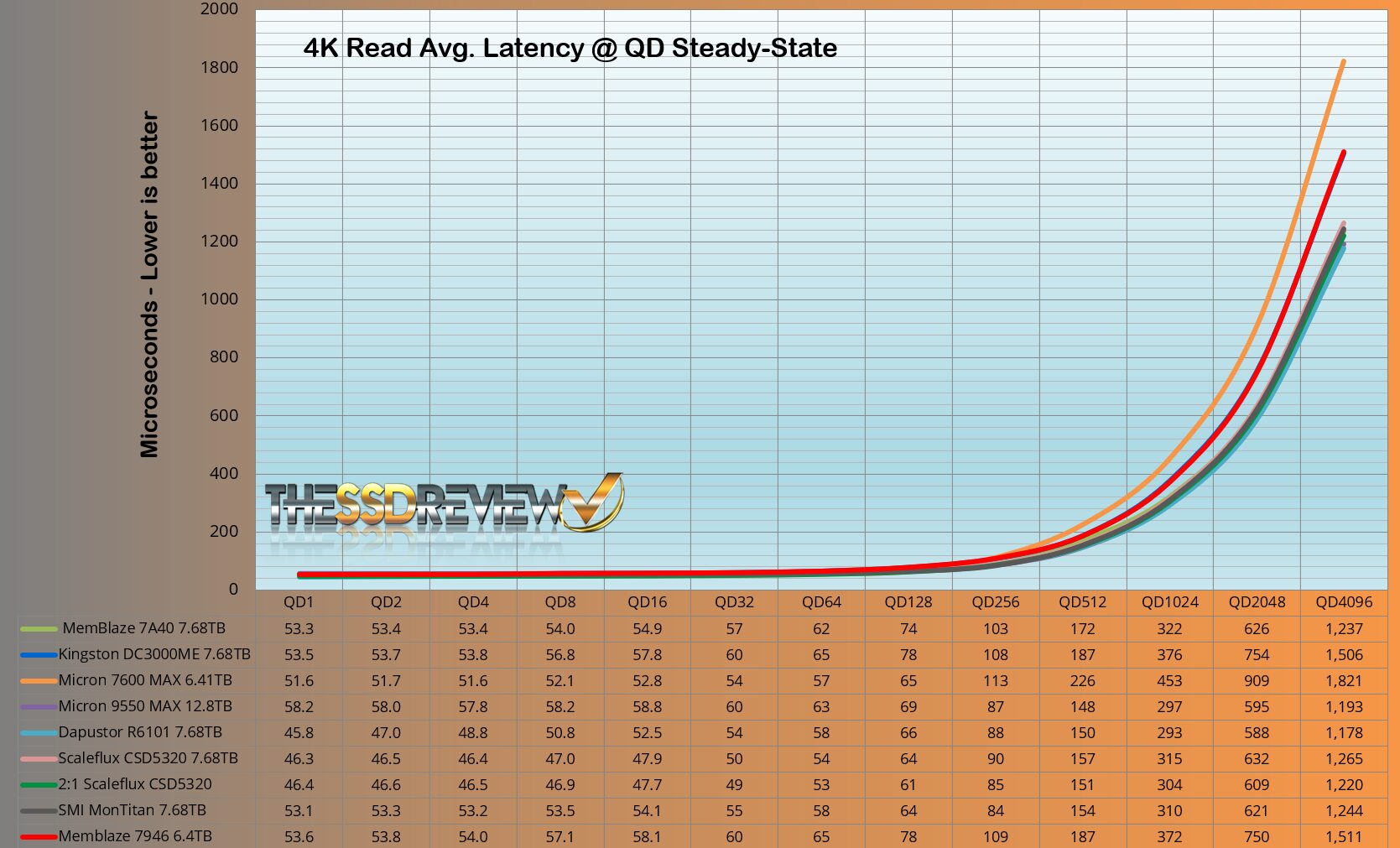 The Memblaze 7946 pulled off an average performance result of 1039K IOPS through QD512-QD4096, which is very impressive for any 3-DWPD SSD.
