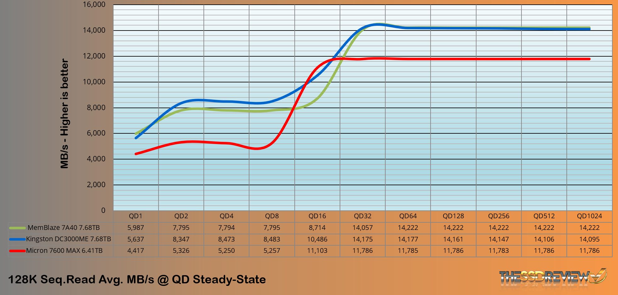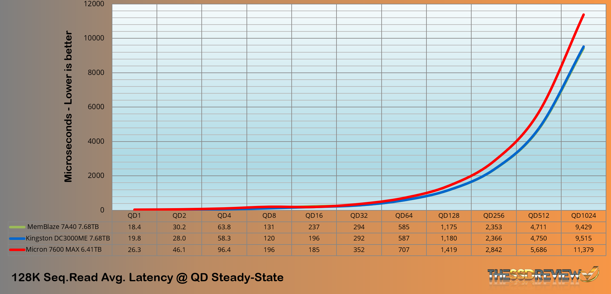 Our test resulted in an average 11.7GB/s read throughput, whereas the listed specification was 12GB/s. Full performance is achieved at QD32 where the performance results in a perfectly flat line until the test was complete. This is very nice to see with 11,786MB/s being pretty much the dead on speed through QDs 32, 64, 128, 256, 512 and 1024.